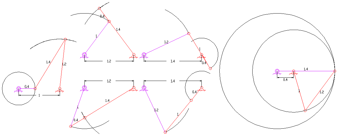 4절 링크의 구성은 볼록, 오목, 교차의 세 가지 유형으로 분류할 수 있다. 볼록 및 오목한 경우에는 두 링크가 서로 교차하지 않는다. 교차 링크에서는 두 링크가 서로 교차한다. 볼록한 경우 네 개의 내각이 모두 180도 미만이고, 오목한 구성에서는 한 내각이 180도보다 크다. 사각형의 두 대각선 길이 사이에는 간단한 기하학적 관계가 존재한다. 볼록 및 교차 링크의 경우, 한 대각선의 길이가 증가하는 경우에만 다른 대각선의 길이가 감소한다. 반면에 비볼록 비교차 링크의 경우는 반대이다. 한 대각선이 증가하는 경우에만 다른 대각선도 증가한다.[4]