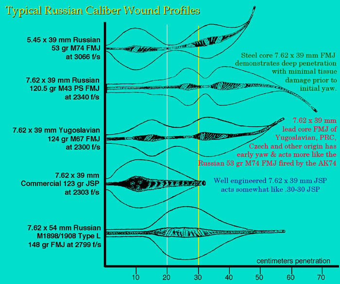 군용 5.45×39mm 탄환은 파편화되는 군용 5.56×45mm NATO 탄환보다 관통력이 더 우수하다.[18][19][20][21]
