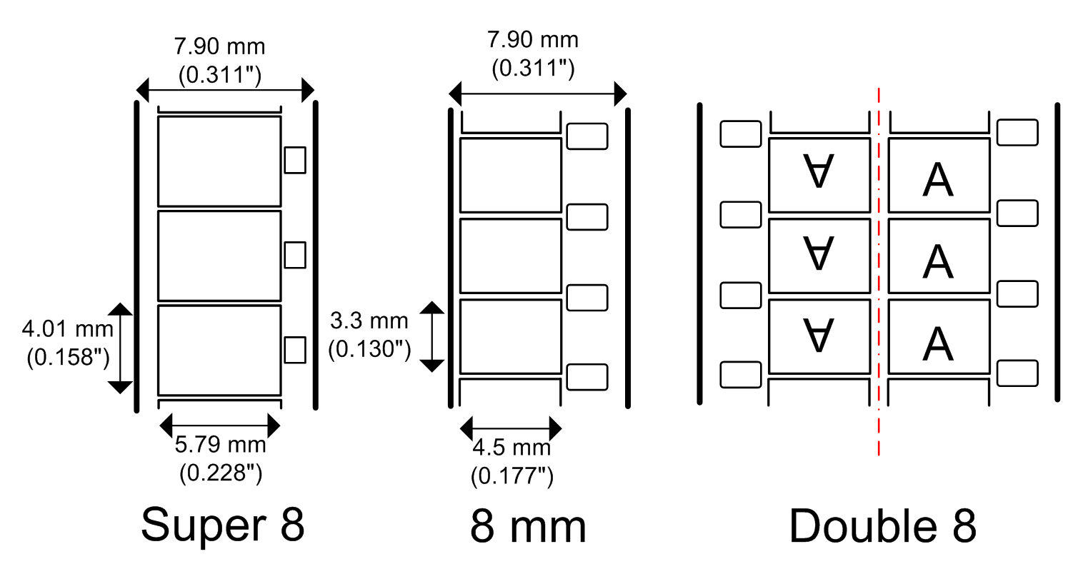 8mm 필름 규격은 크게 더블 8, 슈퍼 8, 싱글 8, 스트레이트 에이트, 울트라팬 8로 나뉜다.