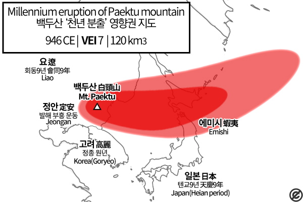 고려사(高麗史) 세가(世家)에서는 고려 정종 원년(946년)에 ‘이 해 천고(天鼓)가 울리므로 사면령을 내렸다.’고 기록하였다.[31][27][32] 일본의 역사서인 흥복사연대기(興福寺年代記)에서는 천경 9년(946년) 11월 3일 ‘천경의 밤에 하얀 화산재가 눈과 같이 내렸다.’라고 기록하였다.[33][29]10세기 중반 고대 한국과 일본에서 기록된 여러 기상 현상은 천년 화산 폭발로 인해 발생했을 수 있다. ''일본기략''(Japan Chronicle)에는 944년 2월 19일, 자정 무렵 진동과 함께 위에서 나는 소리가 있었다고 기록되어 있다.