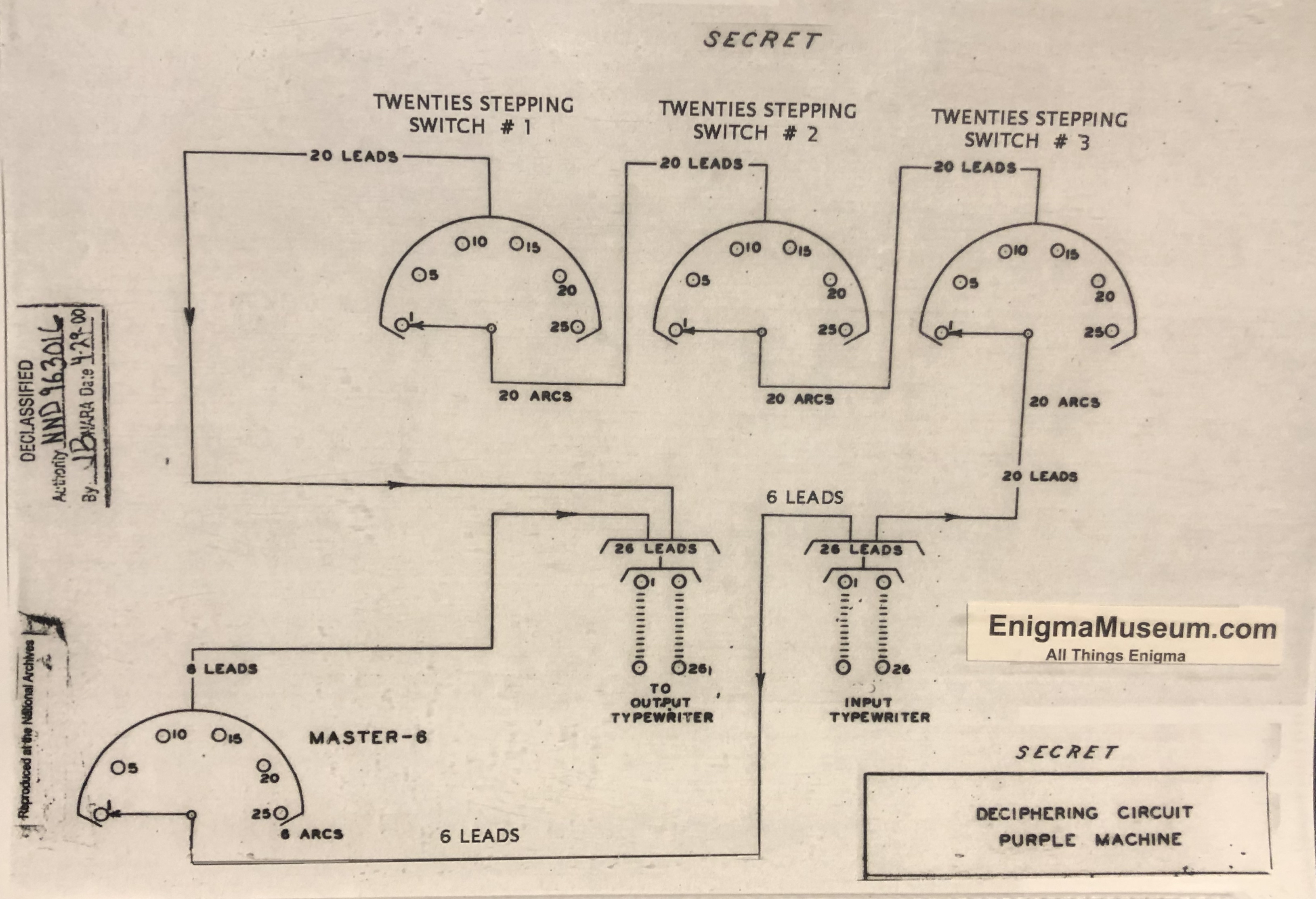 미국은 1945년 독일 패망 후 독일 주재 일본 대사관에서 퍼플 기계의 일부를 입수했다. 미국은 일본이 1939년과 1940년 워싱턴에서 복제 기계(또는 퍼플 아날로그 기계)를 제작할 때 영국 정보국(SIS)의 레오 로젠이 선택한 것과 거의 동일한 구조의 스텝 스위치를 사용했다는 것을 발견했다. 이 스텝 스위치는 유니셀렉터였으며, 미국, 영국, 캐나다, 독일, 일본 등 자동 전화 교환 시스템이 광범위하게 구축된 국가에서 대량으로 사용되는 표준 부품이었다. 미국은 퍼플 아날로그 기계의 각 단계에서 4개의 6레벨 스위치를 사용했고,[4] 일본은 3개의 7레벨 스위치를 사용했다. 둘 다 20s 암호를 동일하게 나타냈다. 그러나 이것들은 때때로 주장되는 것처럼 2단계 움직임 또는 스트로거 스위치가 아니었다.[10]