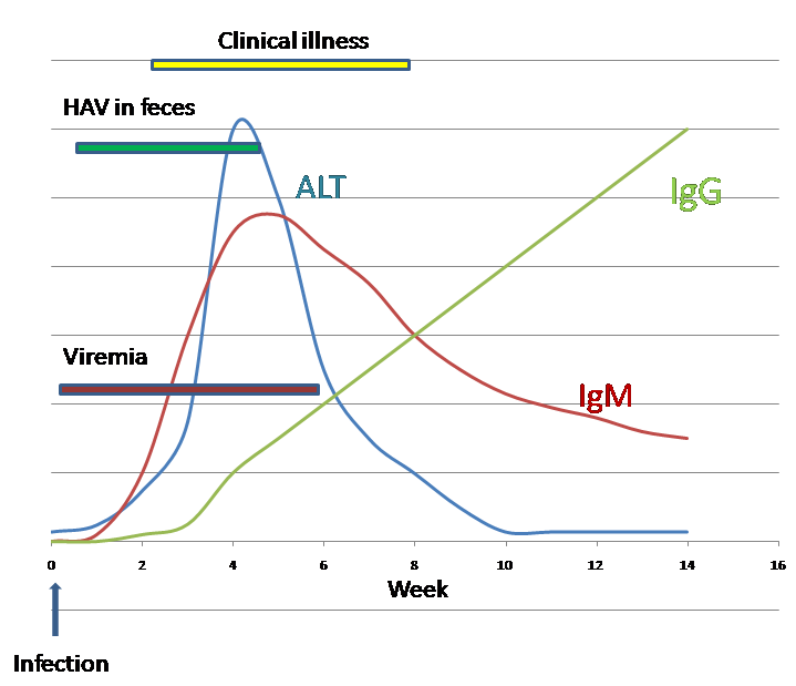 A형 간염 바이러스는 임상 증상이 나타나기 2주 전부터 감염자의 혈액(바이러스혈증)과 대변에서 발견될 수 있다.[46]