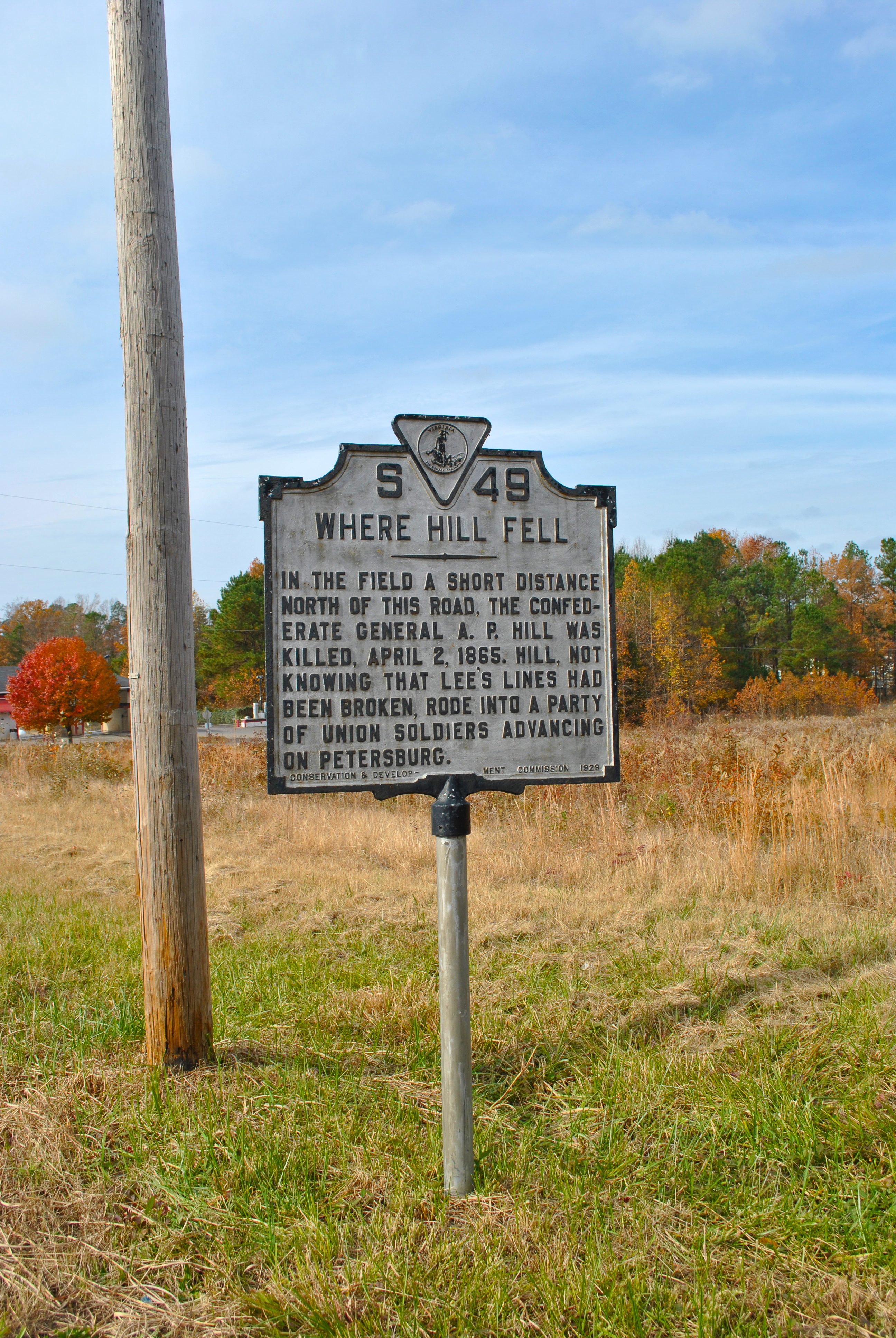 힐은 남부연합이 무너지는 모습을 보지 않겠다고 말했는데, 실제로 1865년 4월 2일 (로버트 E. 리 장군이 애퍼매턱스 코트 하우스에서 항복하기 7일 전), 참모 장교 한 명만을 데리고 피터스버그 전선에 나갔다가 북군 제138 펜실베이니아 연대의 존 E. 모크 상병에게 사살되었다.[42] 힐은 항복을 권유하려 했지만, 북군 병사들은 거부하고 힐의 가슴에 총을 쐈다. 소총탄은 그의 심장을 관통하여 왼쪽 엄지손가락을 잘라냈다.[43][44] 힐은 땅에 쓰러져 몇 순간 만에 사망했다.19세기 후반, 힐이 사망한 장소를 기념하기 위한 노력이 시작되었으며, 1888년, 1890년, 1903년에 그 장소를 찾으려는 시도가 있었다.[45] 1911년에 남부연합 참전 용사의 아들들(Sons of Confederate Veterans, SCV)이 힐이 쓰러진 곳을 찾아냈다.