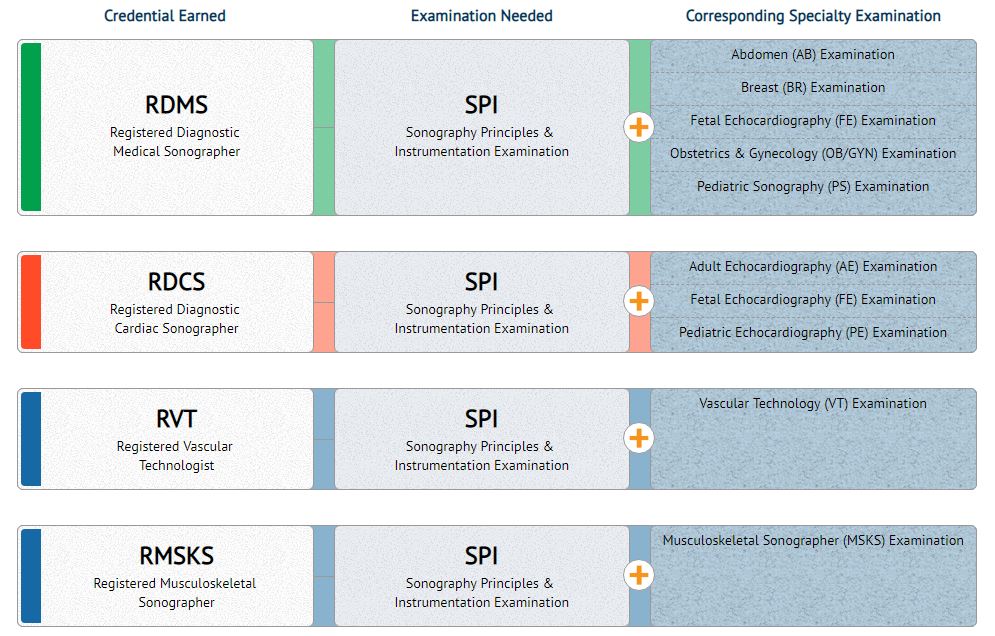 RDMS 자격 증명을 얻으려는 지원자는 서류심사를 통해 응시 자격을 평가받는다. 그 후 2차에 걸친 시험을 통과해야 한다. 1차 시험은 기본 초음파 물리 및 계측 지식을 테스트하는 Sonography Principles and Instrumentation (SPI) 검사이며, 2차 시험은 본격적인 전문 임상 영역에 관한 시험이다. 2차 시험의 전문 분야로는 복부(AB), 유방(BR), 태아 심초음파(FE), 산부인과(OB/GYN) 및 소아 초음파(PS) 등이 있다.[1]