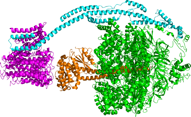 FO와 F1은 내부적인 줄기(γ)와 외부적인 줄기(b)로 연결되어 있다.[7] 이 효소는 유산소 호흡을 통해 ATP를 합성한다. ATP 합성 효소는 '''ATP 아제 활성'''도 가지고 있다.[37]