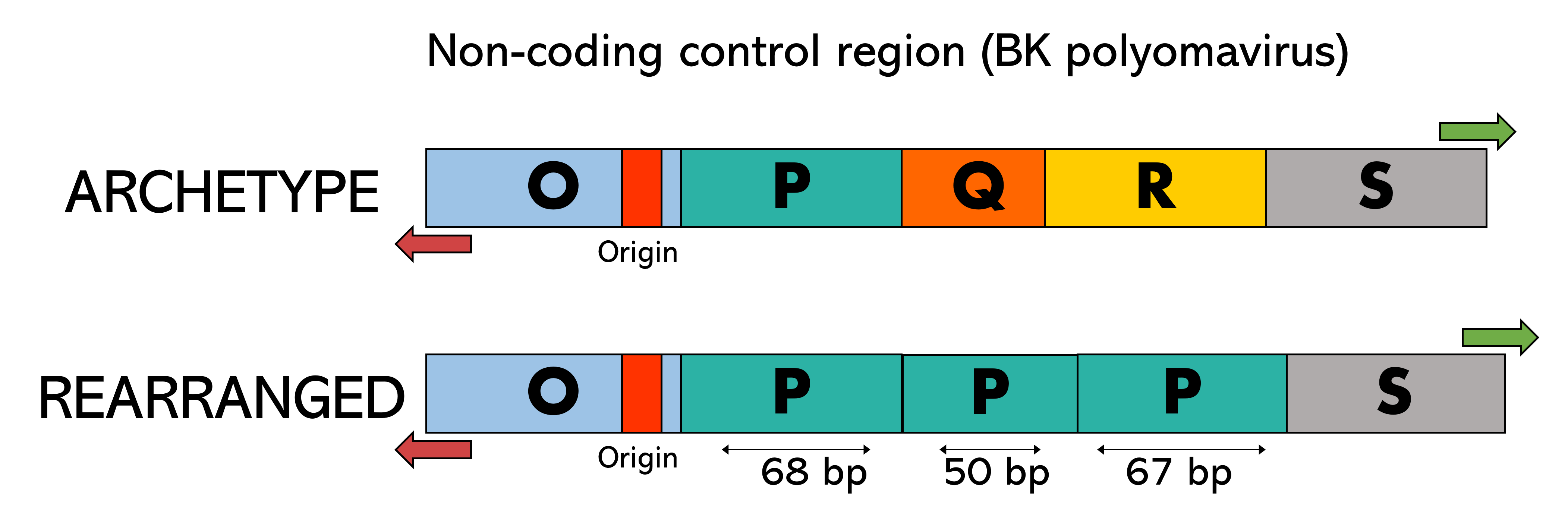 NCCR 서열 변이(원형 또는 재배열)에 따른 다양한 바이러스 형태. NCCR에는 O,P,Q,R,S 블록과 그 변형이 포함되어 있다.