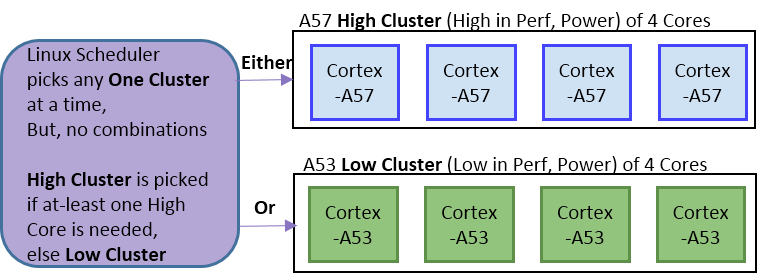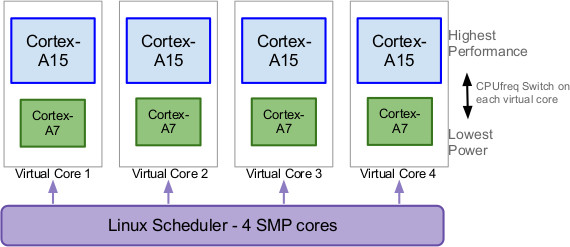 인-커널 스위처(IKS)를 통한 CPU 마이그레이션은 'big' 코어와 'LITTLE' 코어를 짝지어 사용하며, 하나의 칩에 여러 개의 동일한 쌍이 있을 수 있다. 각 쌍은 '가상 코어'로 작동하며, 한 번에 하나의 실제 코어만 완전히 전원이 켜져 실행된다. 'big' 코어는 수요가 높을 때 사용하고, 'LITTLE' 코어는 수요가 낮을 때 사용된다.