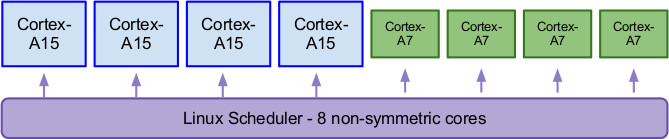 - 2개의 Cortex-A15 코어와 4개의 Cortex-A7 코어와 같은 비대칭 SoC를 쉽게 지원한다.