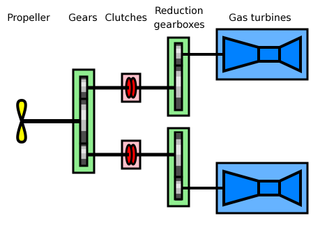 | 설명 | COGAG (복합 가스 터빈 및 가스 터빈)은 선박에 사용되는 추진 플랜트의 일종이다. COGAG 방식은 두 개의 가스 터빈을 기어박스에 연결하여 하나의 추진축을 구동하는 방식으로 구성된다. |