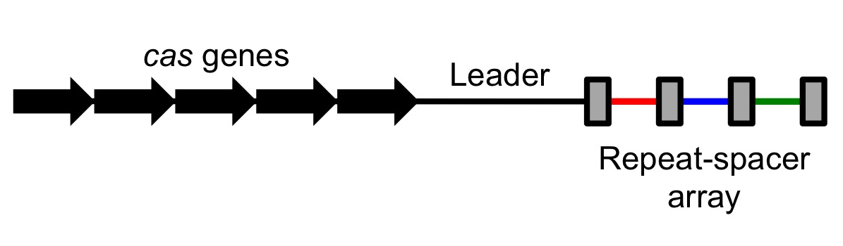 대부분의 CRISPR 자리에는 ''cas'' 유전자군, 선행 서열, 반복-스페이서 서열의 세 가지 요소가 존재한다.[220][230] CRISPR 반복 서열 요소는 24~48개의 염기쌍으로 구성되며[222] 일반적으로 회문 서열을 포함하여 stem-loop 헤어핀 구조를 형성한다.[223] 이 반복 서열 요소 사이에는 비슷한 길이의 스페이서가 삽입되어 있다.[222] 스페이서의 서열은 플라스미드나 파지가 가지는 서열과 동일하거나[224][225][226] 자신의 게놈 내 서열과 동일(self-targeting spacers)한 경우도 있다.[227] 파지가 감염되면 새로운 스페이서가 빠르게 추가된다.[228]