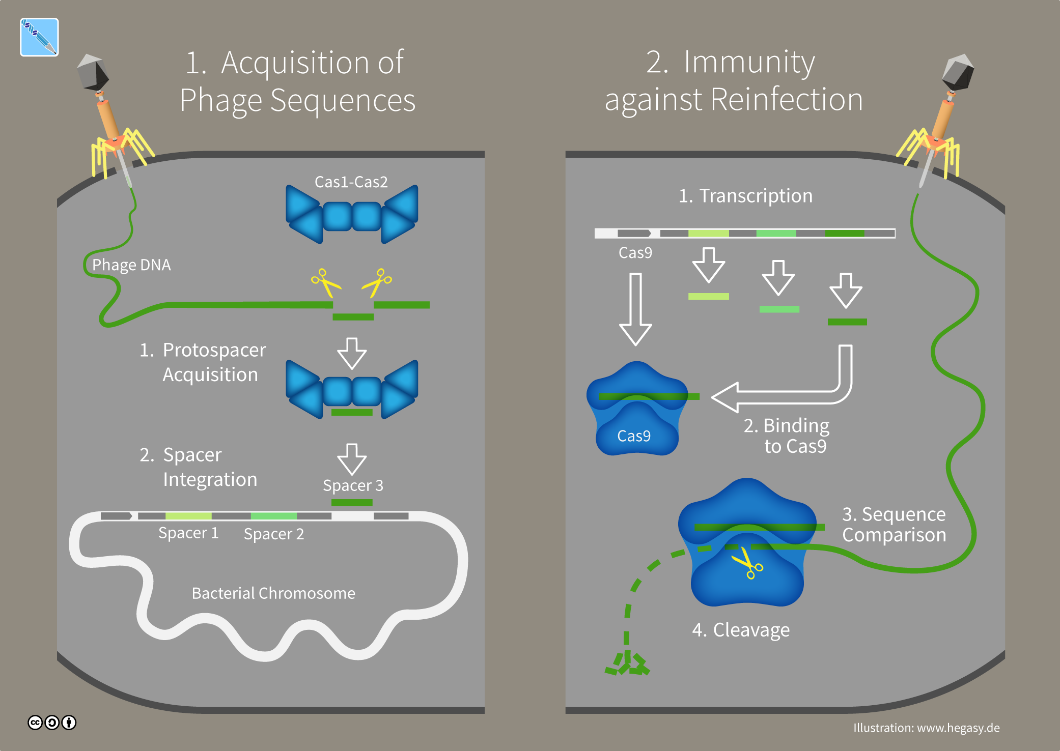 2005년, 세 개의 독립적인 연구팀은 일부 CRISPR 스페이서가 파지 DNA와 플라스미드와 같은 염색체 외 DNA에서 유래한다는 것을 보여주었다.[31][33] 스페이서는 이전에 세포를 공격했던 바이러스에서 수집된 DNA 조각이다. 스페이서의 근원은 CRISPR-Cas 시스템이 세균의 적응 면역에 역할을 할 수 있다는 신호였다.[28][34]