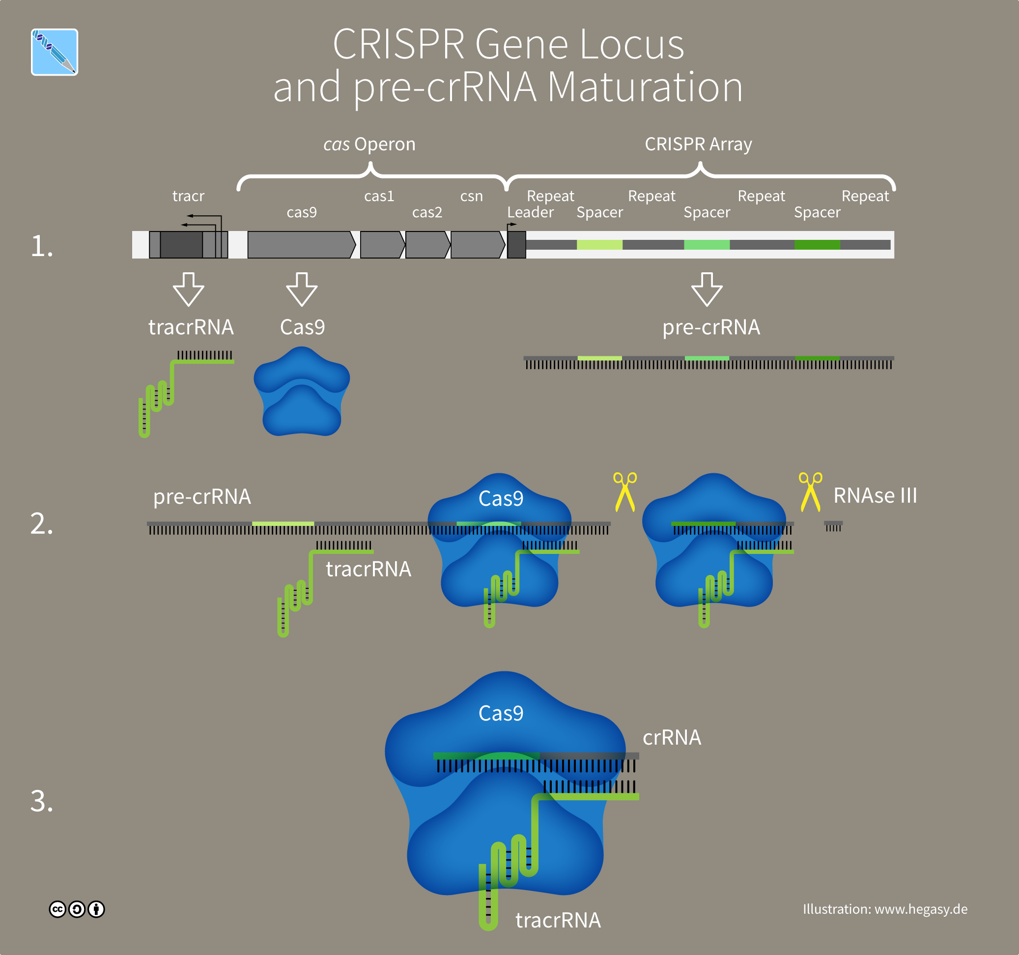 슈도모나스균( ''Streptococcus pyogenes'')에서 유래한 간단한 CRISPR 시스템은 Cas9 단백질에 의존한다. Cas9 핵산내부절단효소는 crRNA와 tracrRNA(trans-activating CRISPR RNA)라는 두 개의 작은 분자를 포함하는 4가지 구성 요소 시스템이다.[40][41] 2012년, 제니퍼 다우드나와 에마뉘엘 샤르팡티에는 두 개의 RNA 분자를 "단일 가이드 RNA"로 융합하여 Cas9 핵산내부절단효소를 더욱 관리하기 쉬운 두 가지 구성 요소 시스템으로 재설계했으며, 이는 Cas9와 결합하여 가이드 RNA가 지정한 DNA 표적을 찾아 절단할 수 있게 한다.[42] 이러한 공헌은 2020년 노벨 화학상 수상으로 이어질 만큼 중요했다. 가이드 RNA의 뉴클레오티드 서열을 조작함으로써, 인공 Cas9 시스템은 분리할 DNA 서열을 표적으로 지정하도록 프로그래밍될 수 있다.[42] 비르기니우스 시크슈니스 등이 참여한 또 다른 공동 연구는 ''S. thermophilus'' CRISPR 시스템의 Cas9도 crRNA 서열을 변경하여 원하는 부위를 표적으로 삼도록 재프로그래밍할 수 있음을 보여주었다. 이러한 발전은 수정된 CRISPR-Cas9 시스템으로 게놈을 편집하려는 노력에 박차를 가했다.[18]