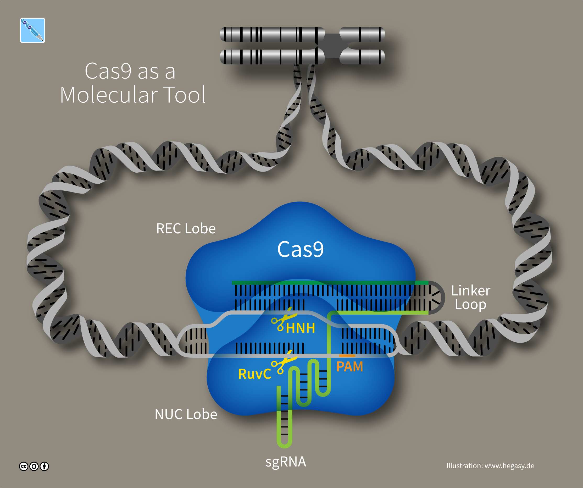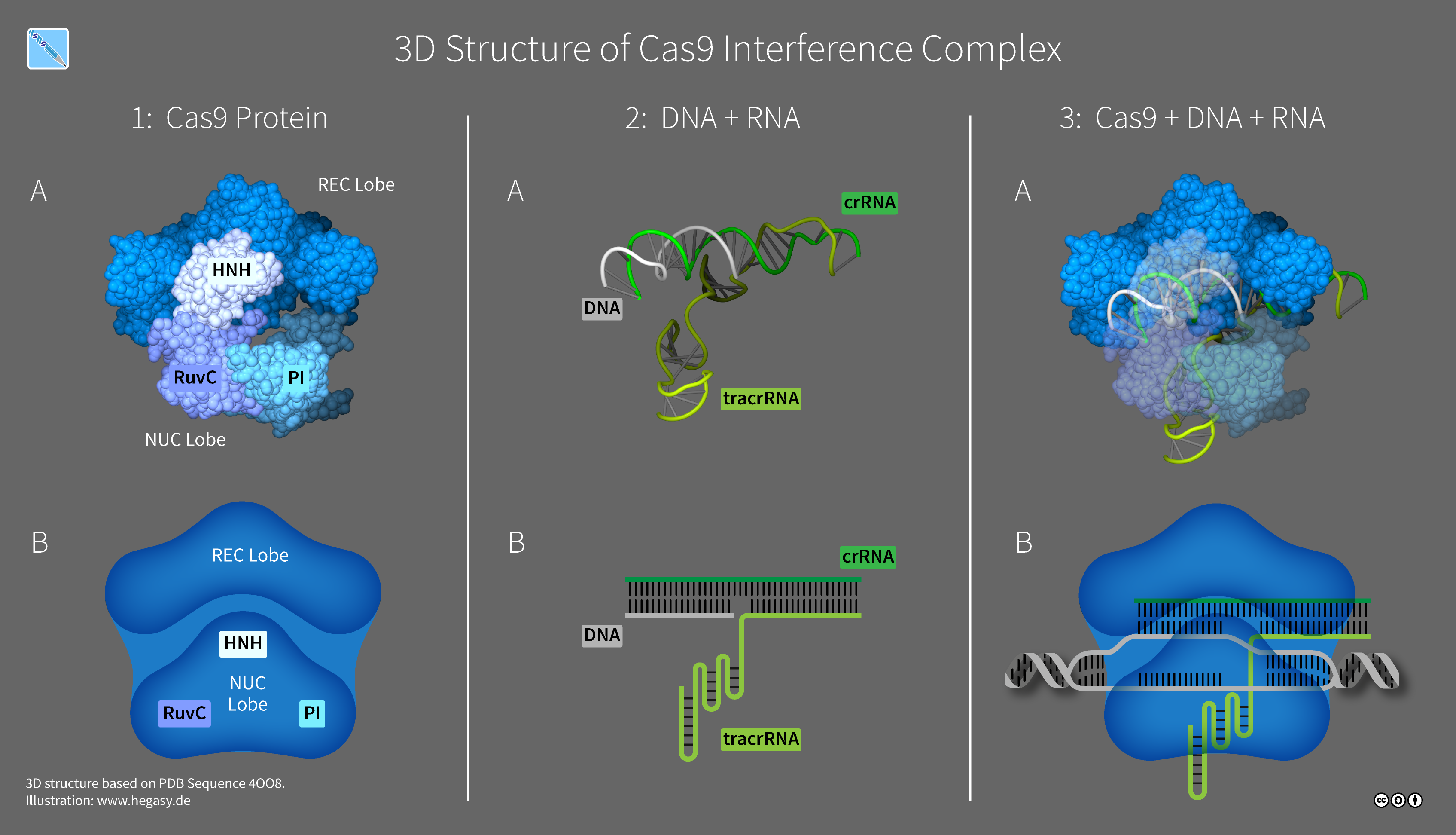 이 가이드 RNA는 DNA 이중 나선을 절단하는 효소인 캐스9(Cas9)과 복합체를 형성한다. 유전자를 조작하고 싶은 부분에 이 효소를 넣으면 가이드 RNA가 목표한 DNA 서열을 찾아내고, 캐스9이 DNA를 절단한다.[237]