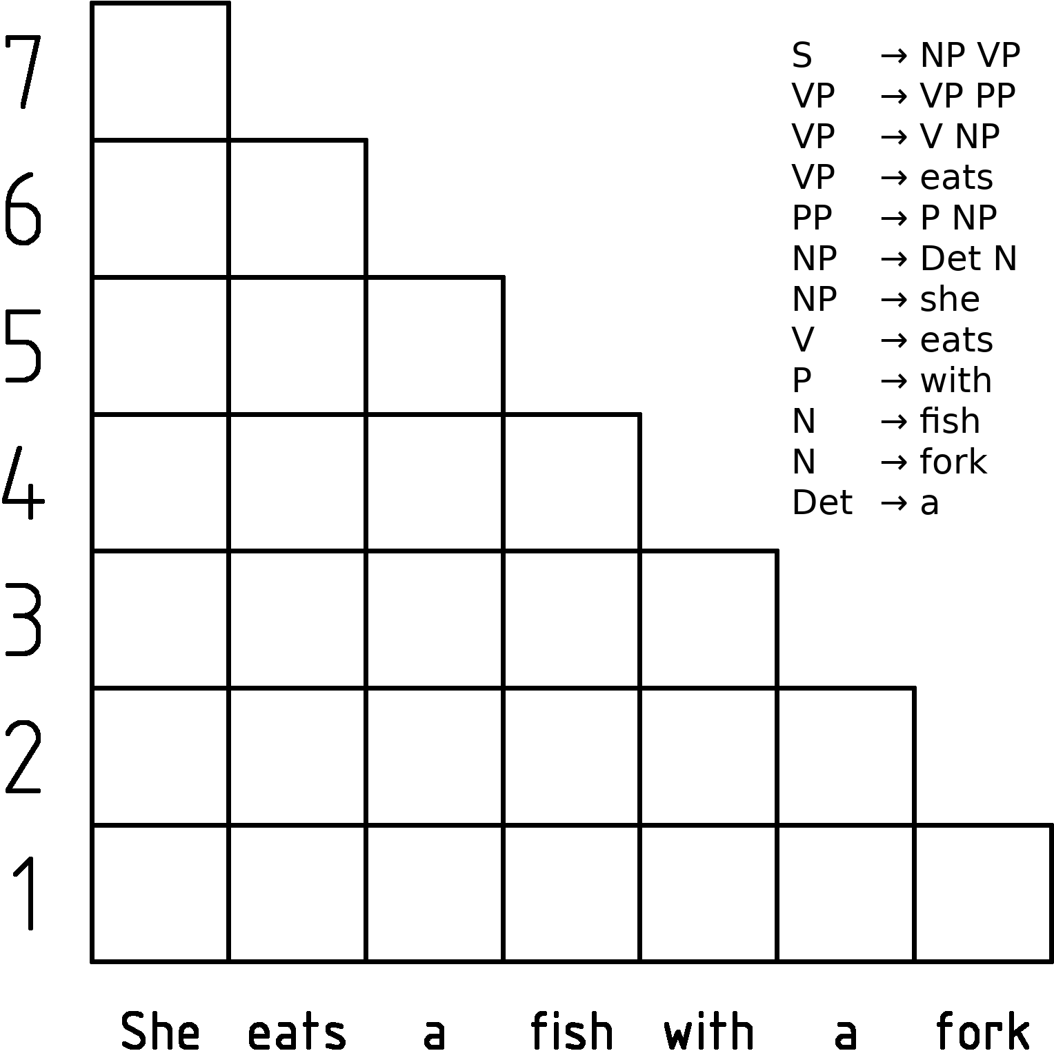 이제 "she eats a fish with a fork" 문장을 CYK 알고리즘으로 분석한다. 아래 표에서 P[i,j,k]는 i번째 행(아래에서부터 1로 시작), j번째 열(왼쪽에서부터 1로 시작)을 의미한다.