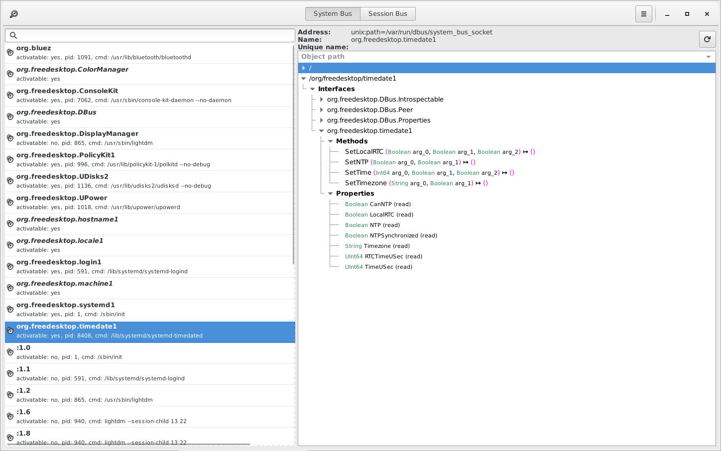 D-Feet를 사용하여 D-Bus 버스에서 기존 버스 이름, 객체, 인터페이스, 메서드 및 시그널을 탐색하는 모습