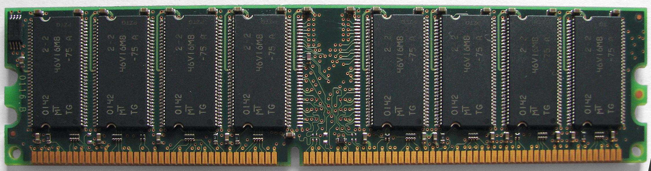 - DIMM (Dual In-line Memory Module): 주로 데스크톱 컴퓨터에 사용되며, 184개의 핀을 가진다. 이는 SDRAM DIMM의 168핀이나 DDR2 SDRAM DIMM의 240핀과 다르다. 기판 하단의 홈(노치) 개수로도 구별할 수 있는데, DDR SDRAM은 하나, SDRAM은 두 개의 노치를 가진다.
