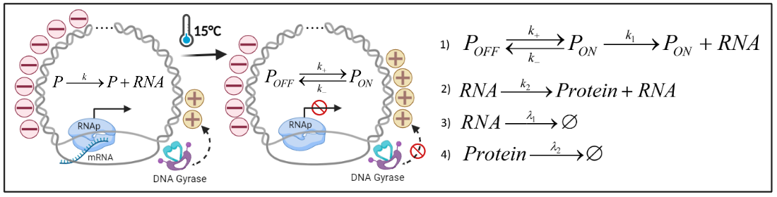 자이레이스(Gyrase)의 활성을 차단하여 냉충격이 DNA의 초나선 상태에 어떻게 영향을 미치는지 그림으로 나타낸다. ' − '와 '+' 기호는 각각 음성 및 양성 초나선을 나타낸다. BioRender.com으로 제작. 또한, 전반적인 DNA 초나선 상태의 함수로서 냉충격 동안의 유전자 발현에 대한 확률적 모델을 보여준다. 프로모터(P)의 ON에서 OFF로의 전환은 전사의 잠금(즉, RNA 생성)을 유발한다. ON 상태일 때, 프로모터는 RNA를 생성할 수 있으며, 이로부터 단백질이 생성될 수 있다. RNA와 단백질은 세포 분열로 인해 항상 분해 또는 희석된다.