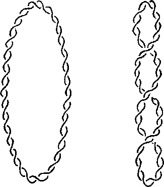 그림 5 말단이 고정된 선형 DNA 분자가 만드는 초나선 구조. 왼쪽은 음의 초나선과 양의 초나선의 나선. 이 그림에서는 DNA 분자의 이중 나선 구조는 생략되어 있다.