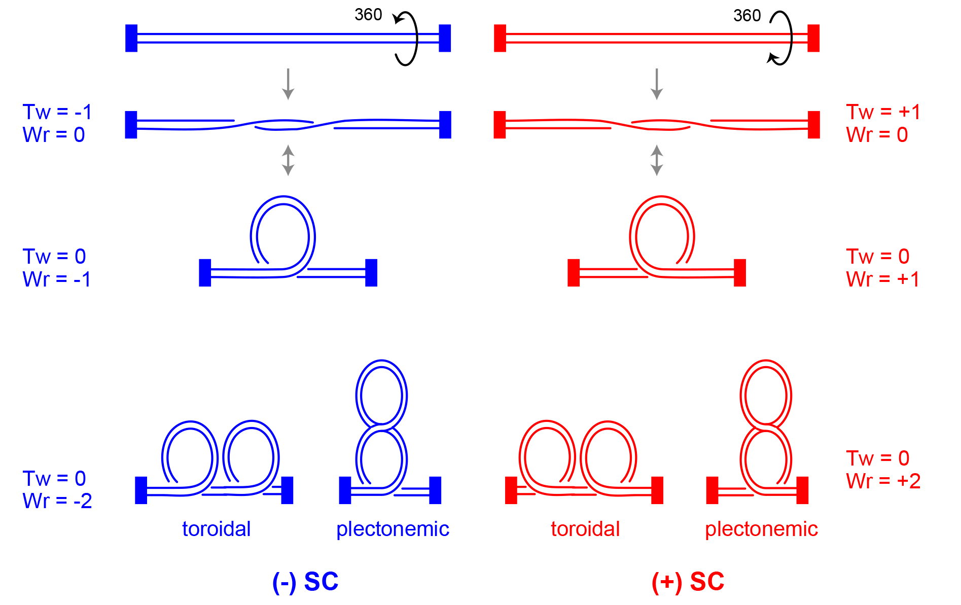 슈퍼코일 DNA는 '''플렉토님'''(plectoneme) 또는 '''토로이드'''(toroid), 또는 둘의 조합의 두 가지 구조를 형성한다. 음의 슈퍼코일 DNA 분자는 한 시작점의 좌선 나선인 토로이드 또는 말단 루프가 있는 두 시작점의 우선 나선인 플렉토네임을 생성한다. 플렉토네임은 일반적으로 자연에서 더 흔하며, 이는 대부분의 세균 플라스미드가 취하는 모양이다. 더 큰 분자의 경우 하이브리드 구조가 형성되는 것이 일반적이다. 즉, 토로이드의 루프가 플렉토네임으로 확장될 수 있다. 토로이드의 모든 루프가 확장되면 플렉토네임 구조에서 분기점이 된다. DNA 슈퍼코일링은 모든 세포 내에서 DNA 포장에 중요하며, 유전자 발현에도 역할을 하는 것으로 보인다.[3][4]