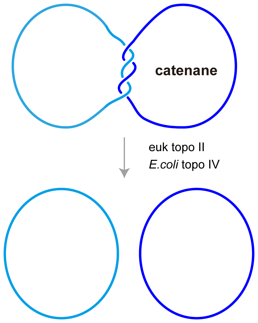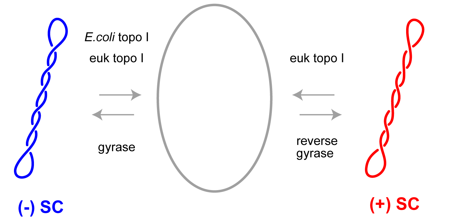 DNA의 이중 나선 구조와 관련된 잠재적인 위상학적 문제는 1953년 제임스 왓슨, 프랜시스 크릭 및 로잘린드 프랭클린에 의해 DNA 구조가 처음 밝혀진 직후에 인식되었으며[11][12][13], 막스 델브뤽과 존 케언스의 연구를 통해 더욱 발전되었다.[14][15]