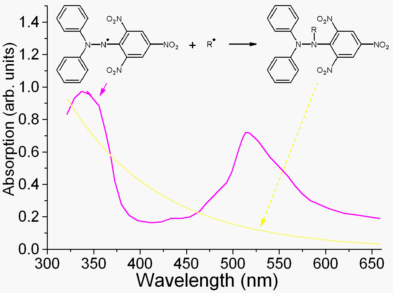 DPPH는 잘 알려진 라디칼이며 다른 라디칼에 대한 트랩("스캐빈저")이다. 따라서 DPPH 첨가 시 화학 반응의 속도 감소는 해당 반응의 라디칼 특성을 나타내는 지표로 사용된다. 약 520nm를 중심으로 하는 강한 흡수대 때문에 DPPH 라디칼은 용액에서 짙은 보라색을 띠고 중화되면 무색 또는 옅은 노란색이 된다. 이 속성을 통해 반응을 시각적으로 모니터링할 수 있으며, 초기 라디칼의 수는 520nm에서의 광 흡수 또는 DPPH의 EPR 신호의 변화에서 계산할 수 있다.[23]