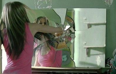 라빈이 분노를 표출하기 위해 손으로 거울을 부수고 있다.