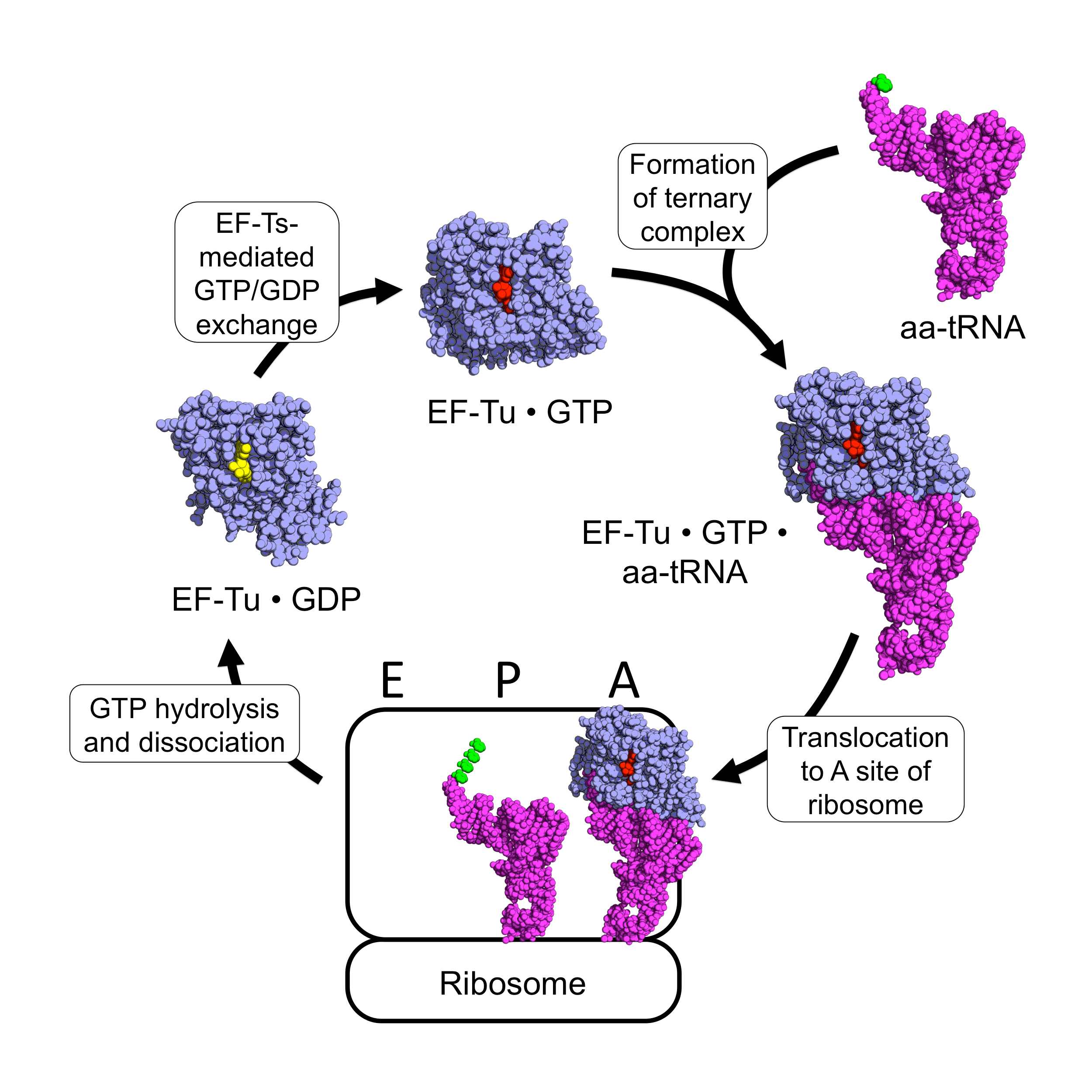 EF-Tu는 단백질 생합성의 폴리펩타이드 신장 과정에 참여한다. 원핵생물에서 EF-Tu의 주요 기능은 올바른 아미노아실-tRNA (aa-tRNA)를 리보솜의 A 부위로 수송하는 것이다. EF-Tu는 G 단백질로서, 구아노신 삼인산(GTP)를 사용하여 그 기능을 수행한다.[48] 리보솜 밖에서 GTP와 결합한 EF-Tu (EF-Tu • GTP)는 aa-tRNA와 결합하여 안정한 EF-Tu • GTP • aa-tRNA 3원 복합체를 형성한다.[8]