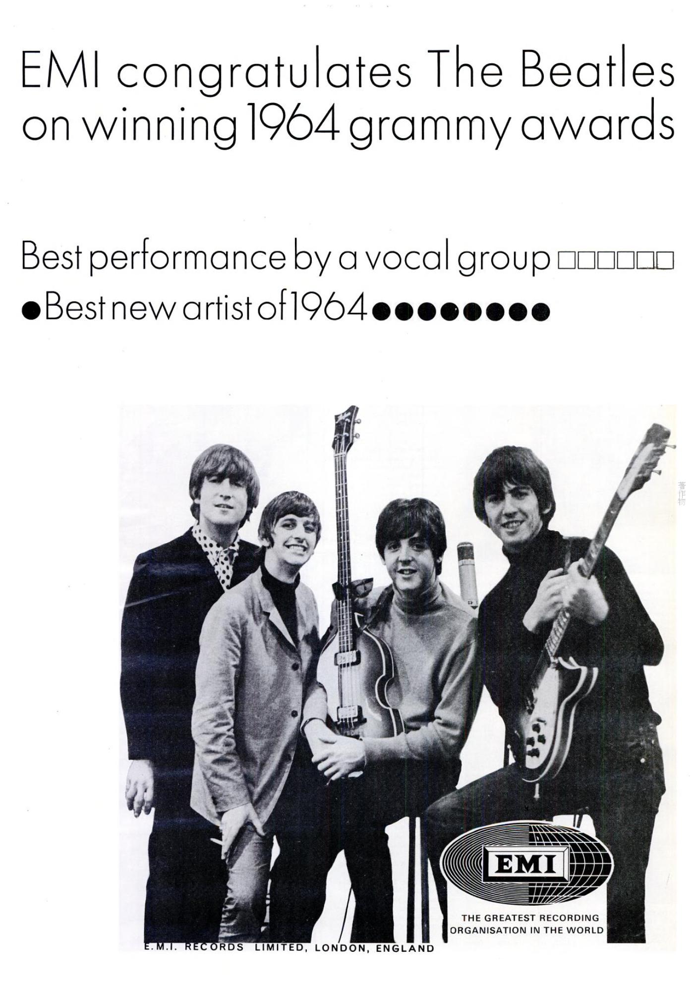 EMI는 1952년에 첫 LP를, 1955년에는 첫 스테레오 음반을 출시하며 음반 기술 혁신을 이끌었다.[105] 1957년, RCA 빅터 및 콜럼비아 레코드와의 오랜 라이선스 계약이 종료되자, 캐피틀 레코드의 주식 96%를 인수하여 미국 시장에 진출했다.[105]1960년대 EMI는 비틀즈를 비롯하여, 비치 보이스, 더 섀도스, 홀리스 등과 계약을 맺었다.[105]