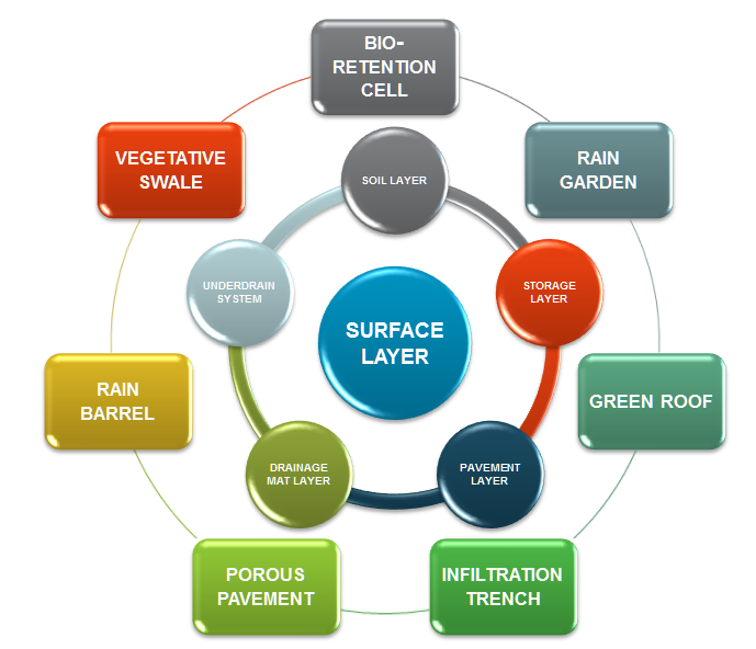 SWMM 5.1.013의 LID 제어 기능에는 다음과 같은 녹색 인프라 유형이 포함된다.[17]