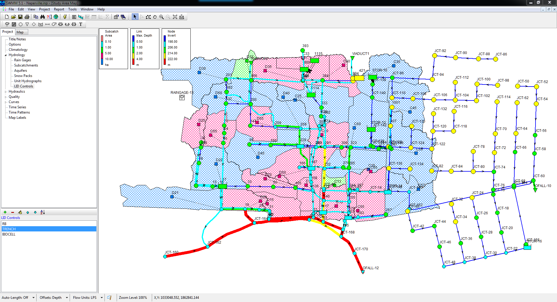 | 토지 표면 | 하나 이상의 세분유역 객체로 표현되며, 강수(비 또는 눈)를 받고, 지하수 구획으로 침투, 운송 구획으로 표면 유출 및 오염 물질 부하를 보냄. | 세분유역, 저영향 개발 (LID) 제어 |