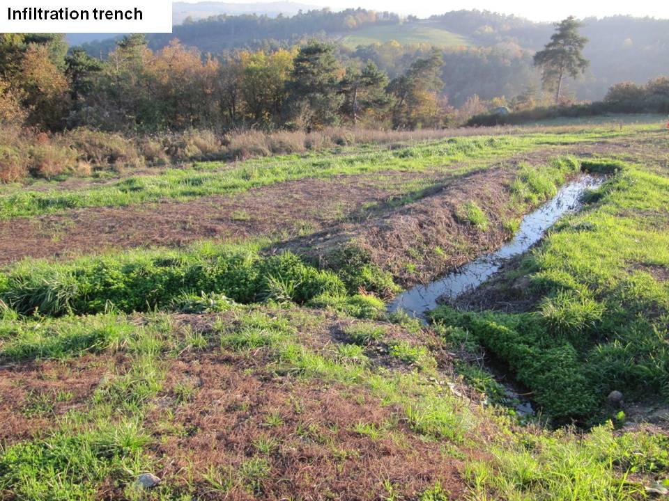- 침투 트렌치: 침투 트렌치는 상류의 불투수 영역에서 유출수를 가로채는 자갈로 채워진 좁은 도랑이다.