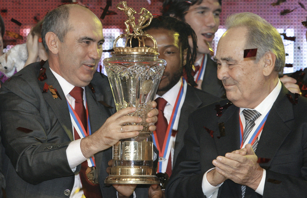 쿠르반 베르디예프와 타타르스탄 대통령 민티메르 샤이미예프가 FC 루빈에게 러시아 프리미어 리그 금메달을 수여하는 시상식에서 러시아 프리미어 리그 챔피언스 컵을 들고 있다.
