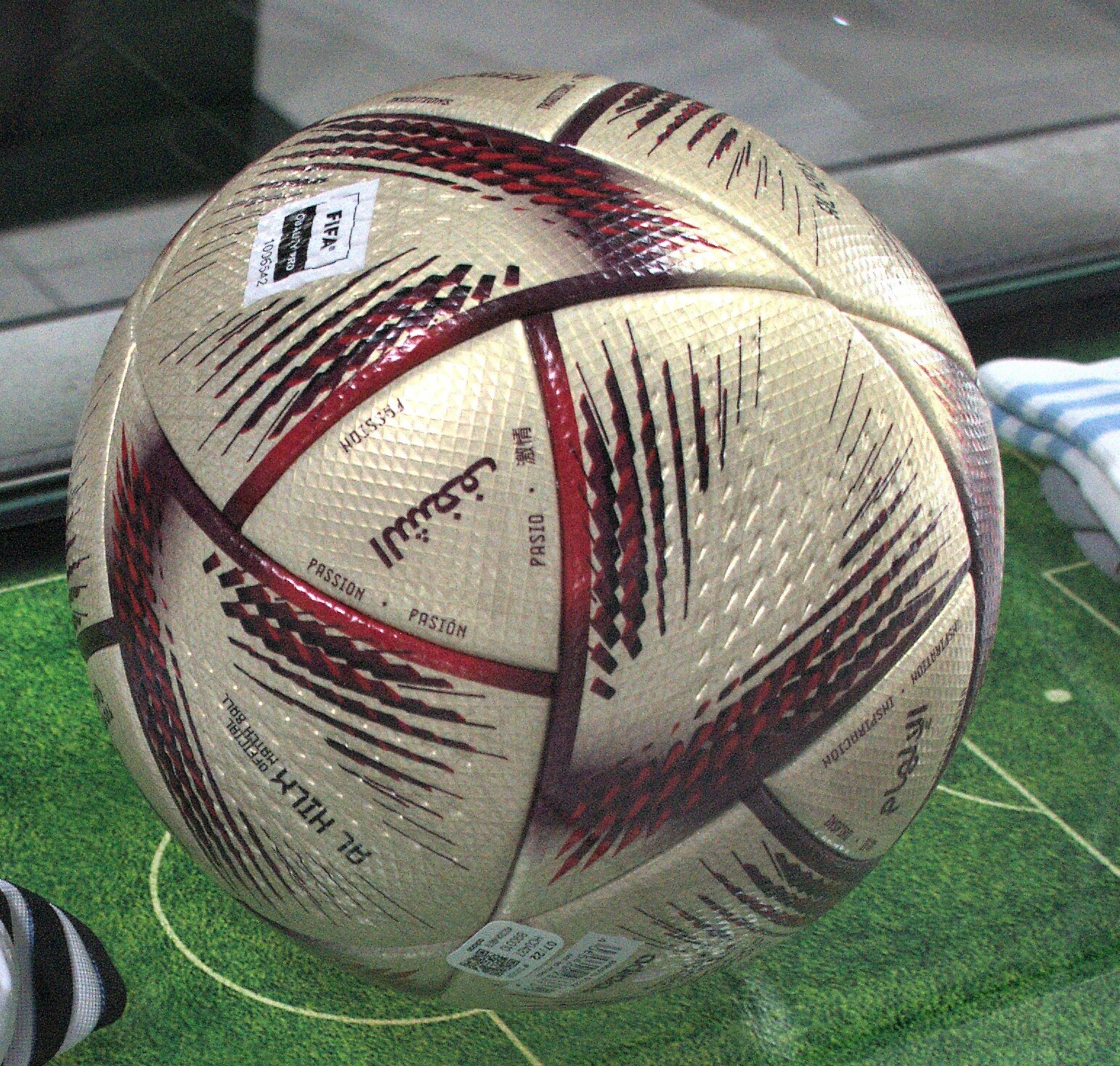 2022년 FIFA 월드컵 | 이름: 알 리흘라 제작: 아디다스 특징: 더 빠른 속도와 정확성을 위해 설계되었으며, 지속 가능한 수성 잉크와 접착제를 사용한 최초의 공이다. image_file: Al Rihla ball.jpg alt: 아디다스 알 리흘라 caption: 아디다스 알 리흘라 |