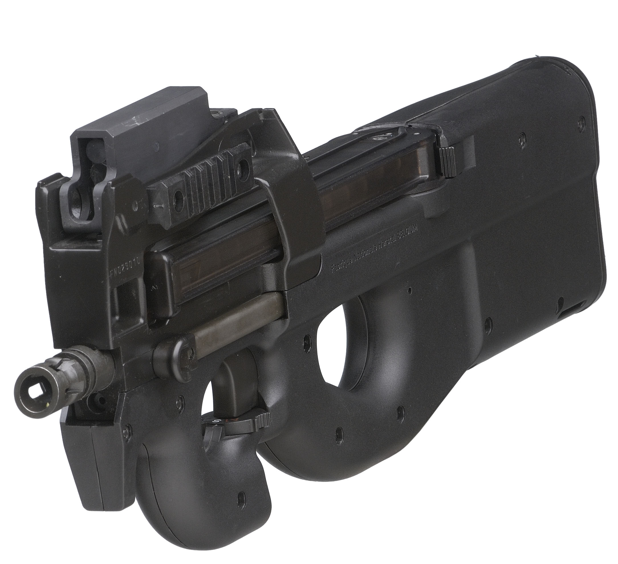 P90(프로젝트 90)는 일반적인 기관단총과 달리, 기존의 권총탄을 사용하지 않고, 소형화된 소총탄과 유사한 형태의 전용 탄약을 사용하는 새로운 형태의 화기로 1980년대 후반에 개발되어, "PDW(개인 방어 화기)"라는 분류로 발표되었다.[140] 발표 당시에는 기계화 부대나 후방 부대 등, 장비나 임무 측면에서 자동소총 등을 표준 장비로 하지 않거나, 장비하기 어려운 환경에 있는 병사가 후방에 침투한 적의 파괴 활동 등에도 대처할 수 있는 편리하고 강력한 자위용 화기로 여겨졌다. 그러나 냉전 종식 후 대테러전이 증가하고, 근접전에 적합한 화기의 수요가 높아짐에 따라, 오히려 건물 등의 폐쇄된 공간에서 활동하는 각종 특수부대용 화기로 자리매김하고 있다.