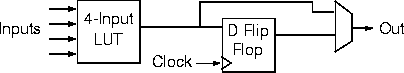 일반적인 FPGA의 논리 블록은 위 그림처럼 4개의 입력 룩업 테이블(lookup table|룩업 테이블영어)과 플립플롭으로 구성된다. 레지스터나 언레지스터 룩업 테이블이 가능한 하나의 출력만 있다. 논리 블록에는 룩업 테이블을 위한 4개의 입력과 클럭 입력이 있다. 클럭 신호(와 높은 팬아웃 신호)는 일반적으로 특별 용도 전용 라우팅망을 통하여 연결되고 다른 신호는 분리하여 관리되기 때문이다.