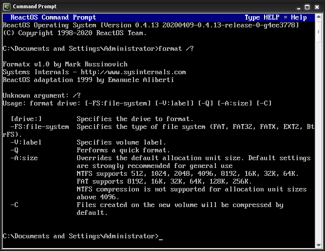 Format 명령어는 디스크 또는 볼륨을 초기화하고 파일 시스템을 설정하는 데 사용되는 명령어이다. 이 명령어는 인텔 ISIS-II, iRMX 86, TRIPOS, 아미가DOS, Z80-RIO, OS-9, FlexOS, PC-MOS, 스파르타DOS X, ROM-DOS, 4690 OS, PTS-DOS, SISNE plus, RT-11 등 다양한 운영 체제에서 구현되었다. MS-DOS 1.0 이상 버전에서는 `/S` 옵션을 사용하여 부팅 가능한 디스크를 만들 수 있으며, `/Q` 옵션은 빠른 포맷을 수행한다. DR DOS 6.0, FreeDOS, ReactOS 등에서도 format 명령어를 사용할 수 있다. ReactOS의 구현은 GPL 라이선스 하에 배포되며 FAT, FAT32, FATX, EXT2, BtrFS 파일 시스템을 지원한다.