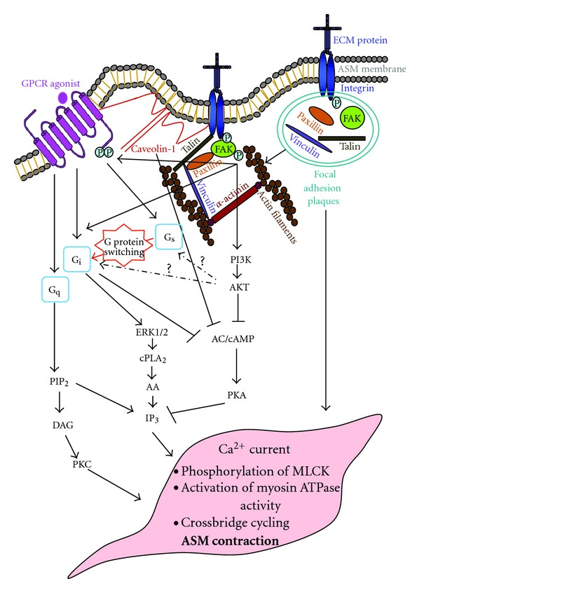 GPCR의 하위 신호는 FAK와 같은 인테그린 신호와 상호 작용할 수 있다.[47] 인테그린 신호전달은 FAK를 인산화시키며, 이는 GPCR Gαs 활성을 감소시킬 수 있다.