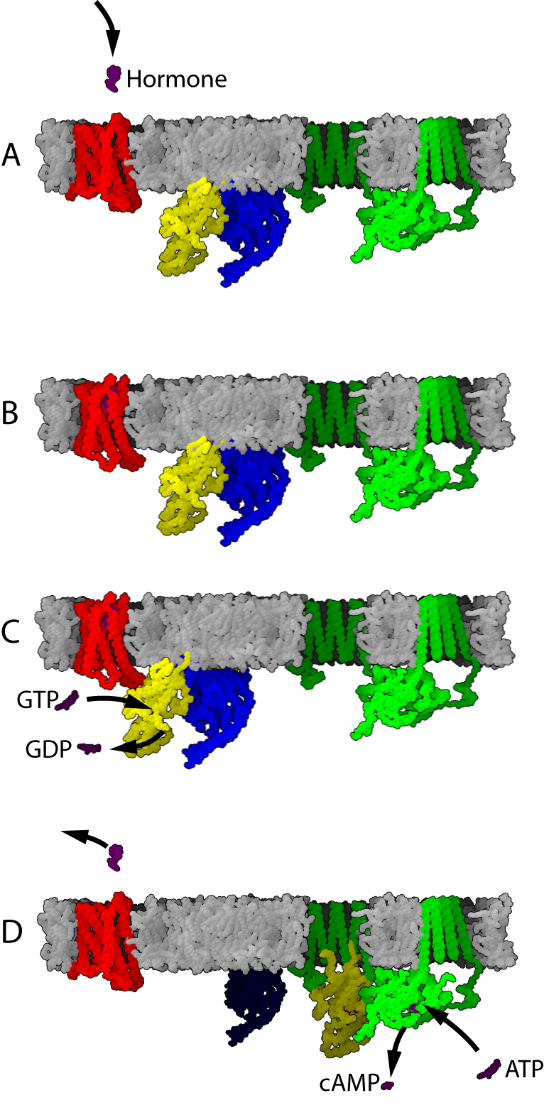 비활성 상태에서 GPCR은 이종 삼량체 G 단백질 복합체에 결합한다. 작용제가 GPCR에 결합하면 입체 구조 변화가 일어나 Gα 소단위체로 전달된다. 활성화된 Gα 소단위체는 GTP를 GDP 대신 교환하며, Gα 소단위체가 Gβγ 이량체 및 수용체로부터 해리된다. 해리된 Gα 및 Gβγ 소단위체는 다른 세포내 단백질과 상호 작용하여 신호 전달 연쇄 반응을 계속하는 반면, 자유로운 GPCR은 다른 이종 삼량체 G 단백질과 다시 결합하여 새로운 복합체를 형성한다.[45]