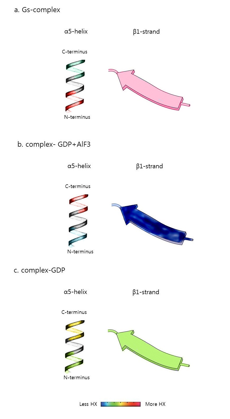 G 단백질이 이질삼합체를 이루고 있을 때와 Gα와 수용체가 복합체를 이루고 있을 때를 비교하면(그림5, a), Gα 단위체에서 α5-helix의 카복시 말단(C-terminus)은 감소된 수소-중수소 교환을 보였다. 이는 α5-helix가 복합체를 이룰 때 수용체를 관통한다는 것을 의미한다. 반면 α5-helix의 아미노말단은 증가된 교환을 보였는데, 이는 α5-helix의 아미노말단이 뉴클레오타이드 결합 부분에 관여하고 있기 때문이다. 복합체가 형성되면서 GDP가 떨어져 나가 뉴클레오타이드 결합 부위가 열리게 되고, 따라서 수소-중수소 교환이 증가하게 된다.[1]