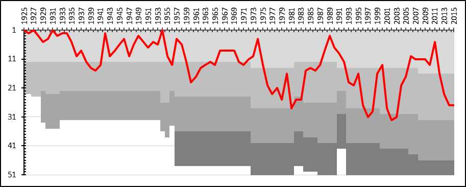 | 2014 | 30 | 9 | 8 | 13 | 31 | 38 | 35 | 11위 | ||