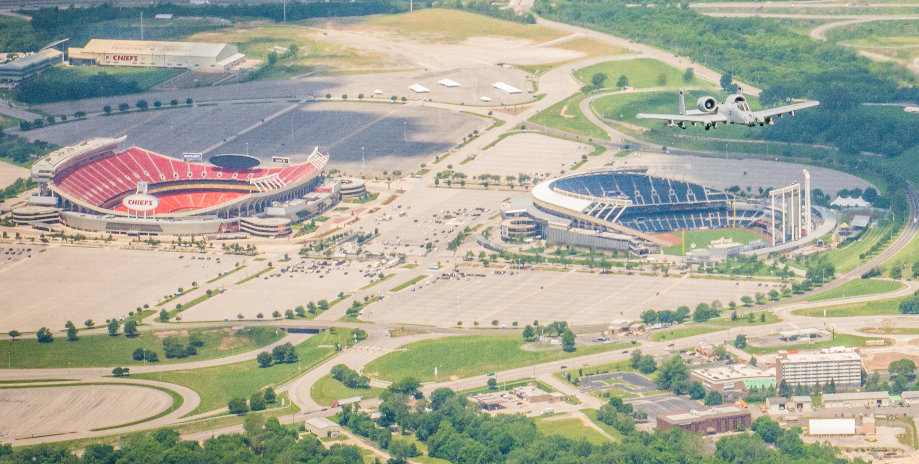 해리 S. 트루먼 스포츠 콤플렉스. 풋볼의 애로헤드 스타디움과 야구의 카우프만 스타디움이 광대한 방문객용 주차장에 둘러싸여 있다.