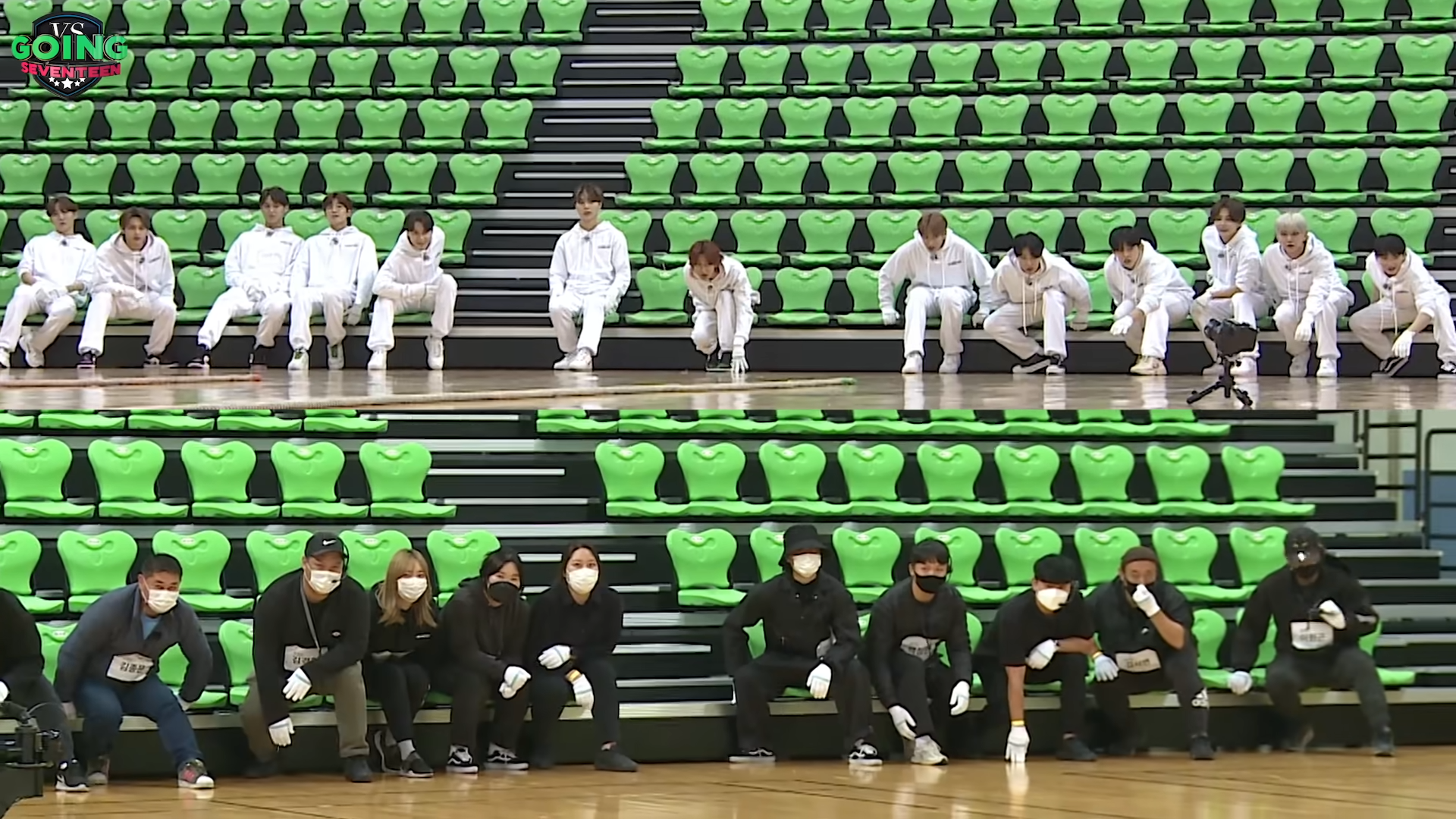 2020년 ''고잉 세븐틴'' 43화에 출연한 세븐틴(위, 흰색)과 일부 ''고잉 세븐틴'' 제작진(아래, 검은색)