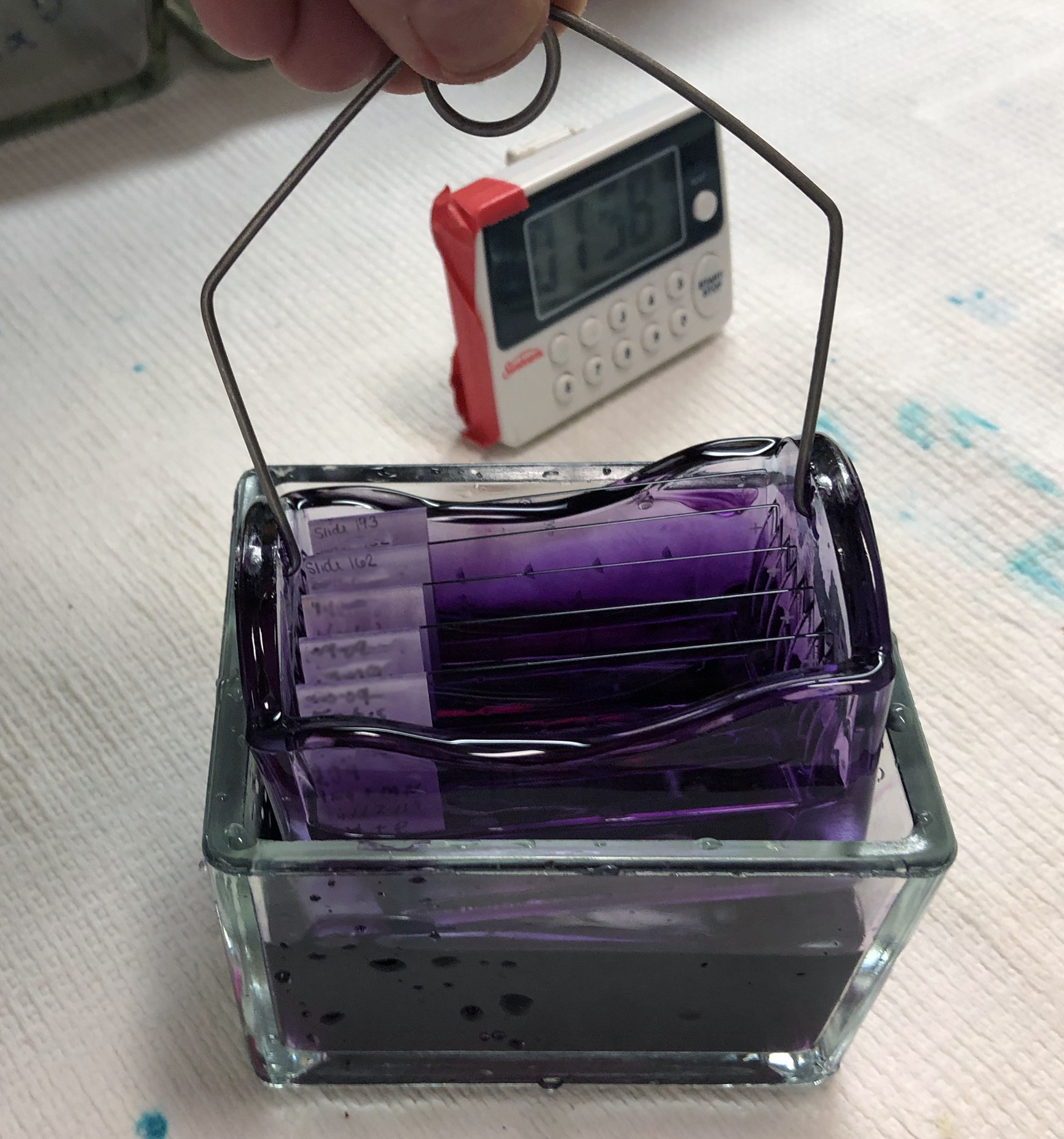 # 과도한 염색을 제거하기 위해 약산 용액으로 헹구는 '분화' 과정을 거친다.