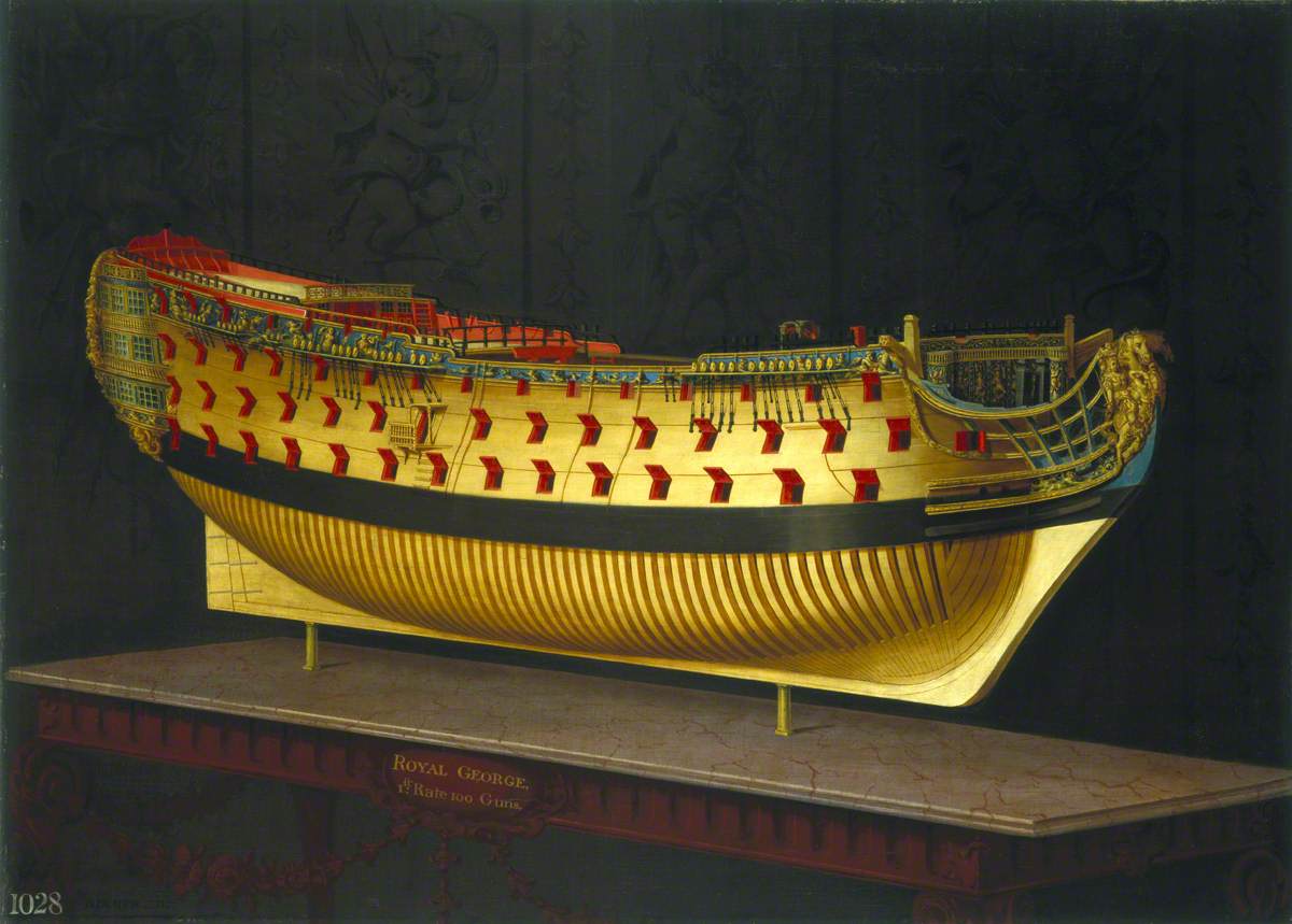 존 클리블리 엘더가 1757년에 그린 HMS 케임브리지 호의 진수식 중 가상으로 이미 떠 있는 HMS 로열 조지 호 (오른쪽).