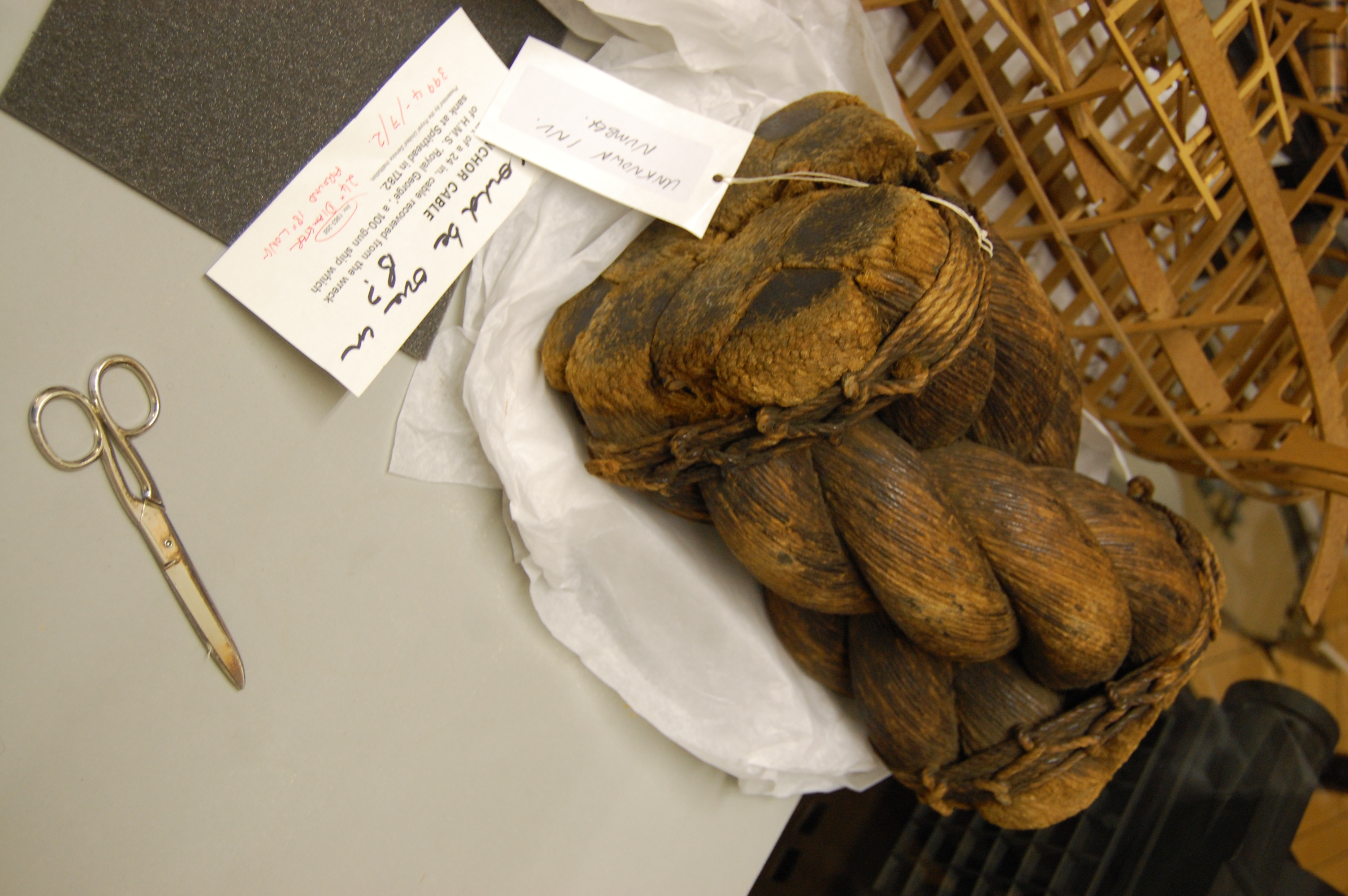 침몰선에서 인양되어 Blythe House의 과학 박물관 창고에 보관되어 있는 24인치 닻 밧줄 단면.