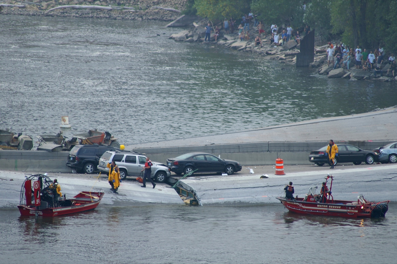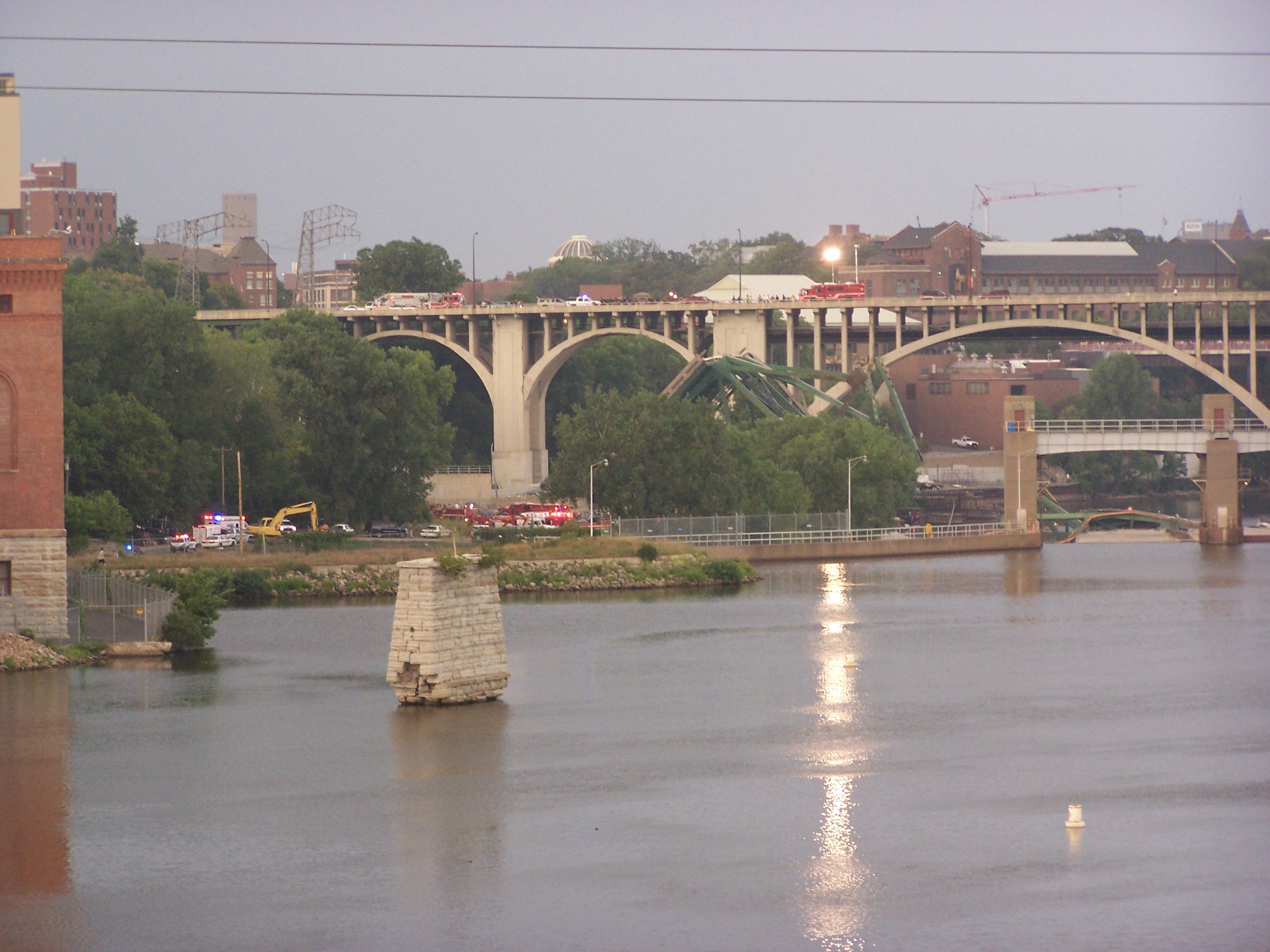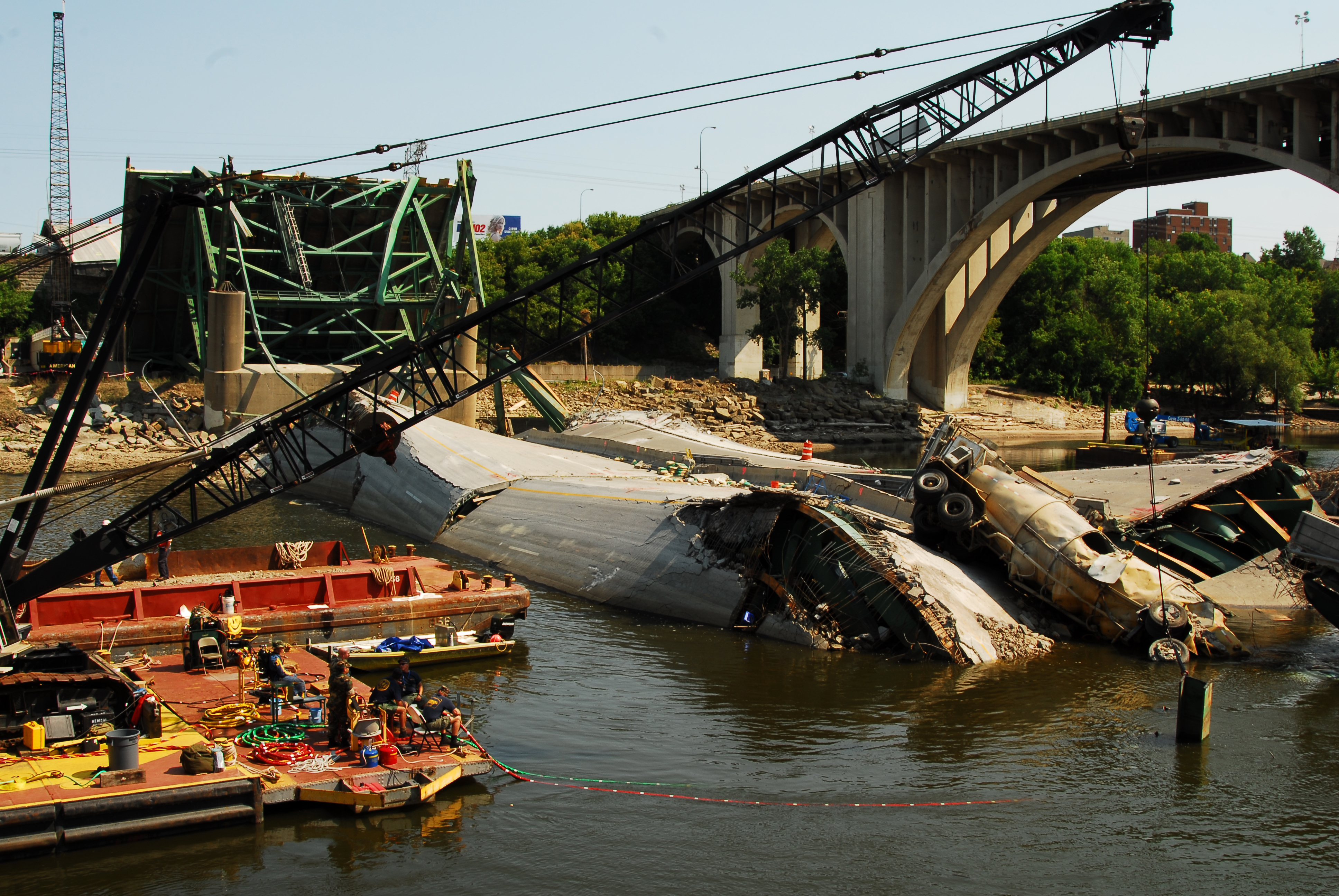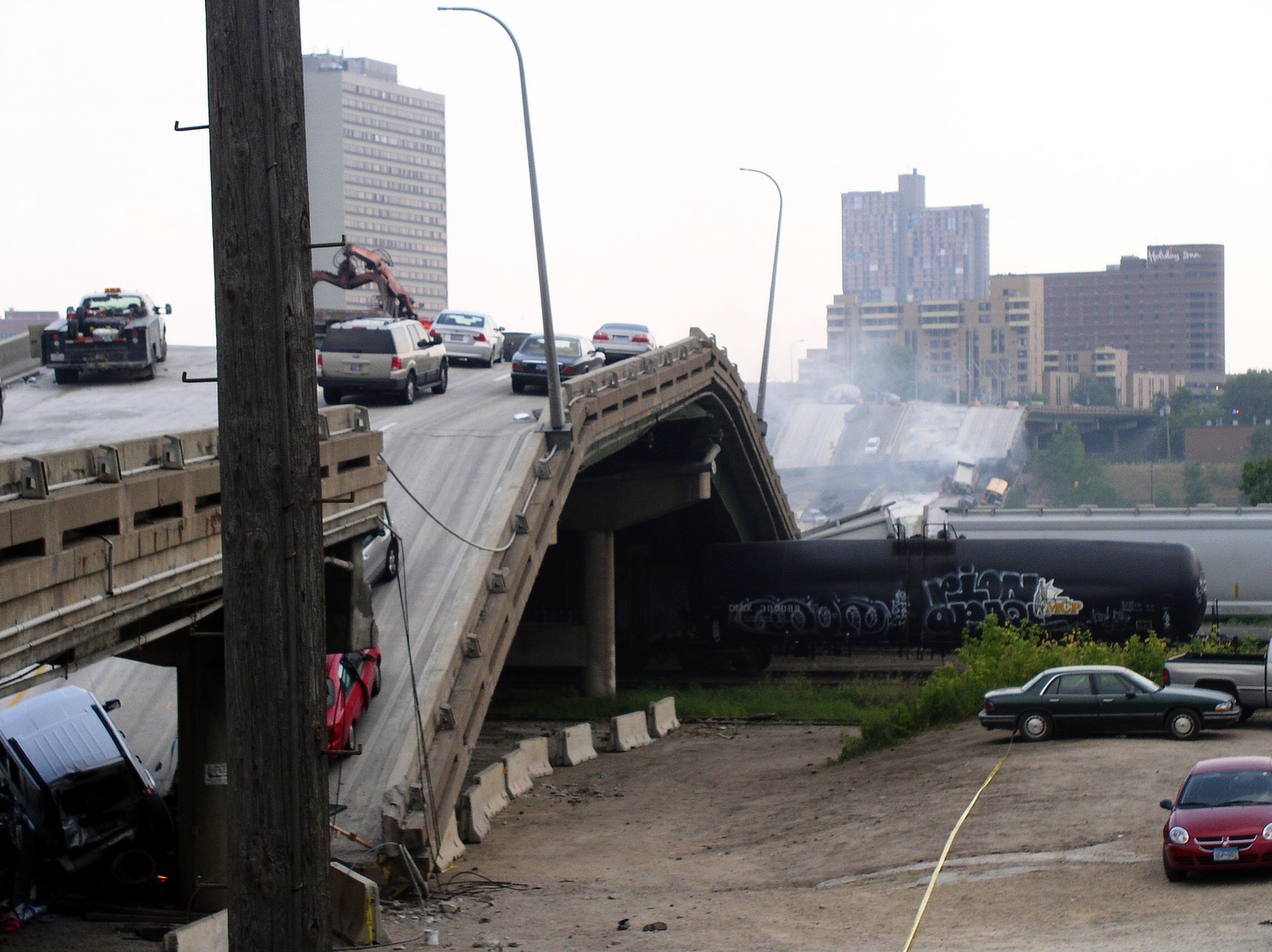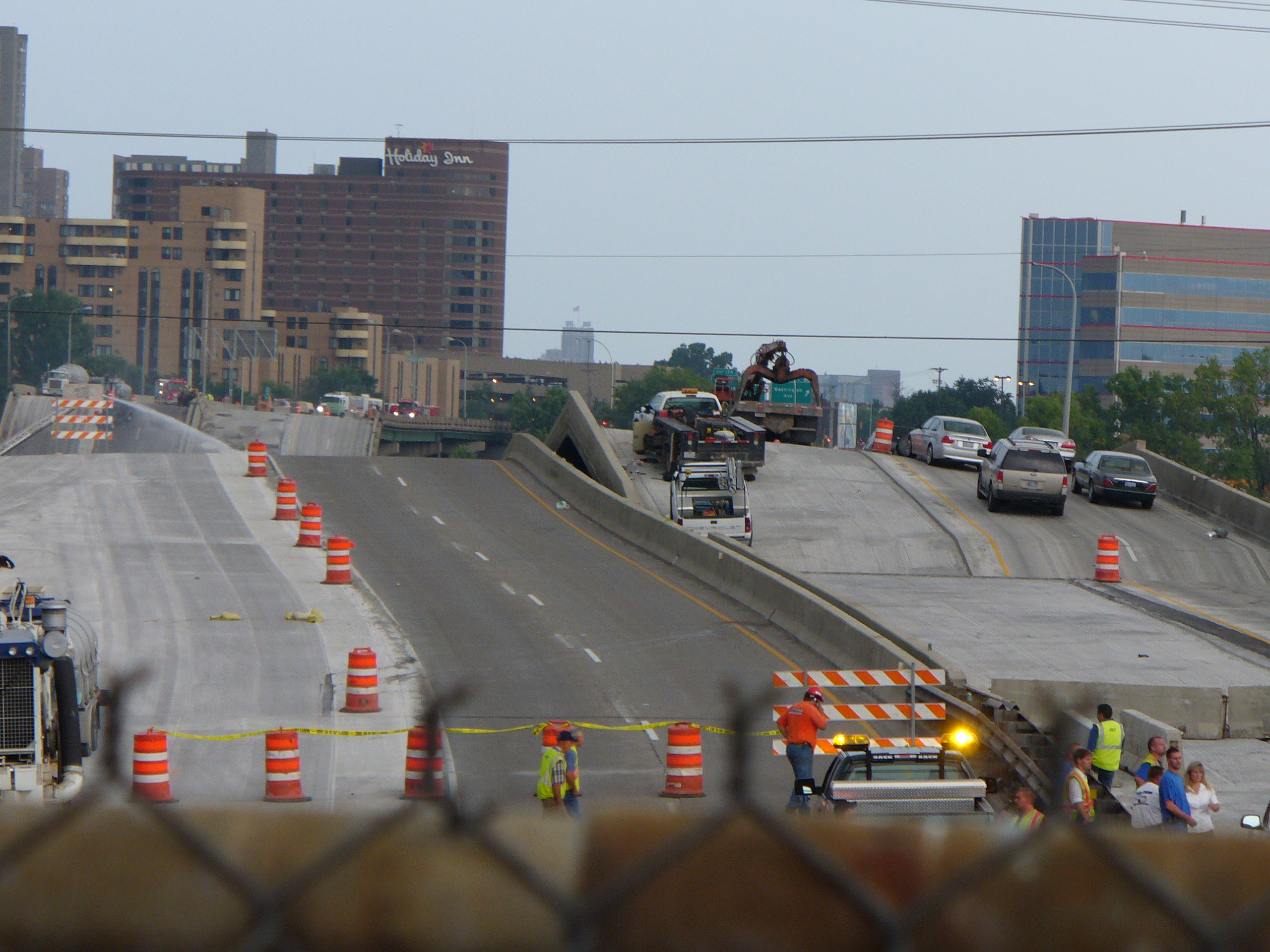 2007년 8월 1일 북아메리카 중부 여름 시간(CDT) 오후 6시 5분경, 미네소타주 미니애폴리스 도심과 미네소타 대학교를 잇는 미시시피강 위의 I-35W 8차선 주간 고속도로 다리가 러시아워 중에 붕괴했다.[346] 당시 다리 위에서는 몇 주간 배수구 정비 등 공사가 진행 중이었고, 미네소타 교통부(Mn/DOT)는 7월 31일과 8월 1일 양방향 통행을 편도 1차선으로 제한한다고 공지한 상태였다.[352][353] 사고 직전 잭해머 작업으로 인한 진동을 느꼈다는 증언도 있었다.[349]