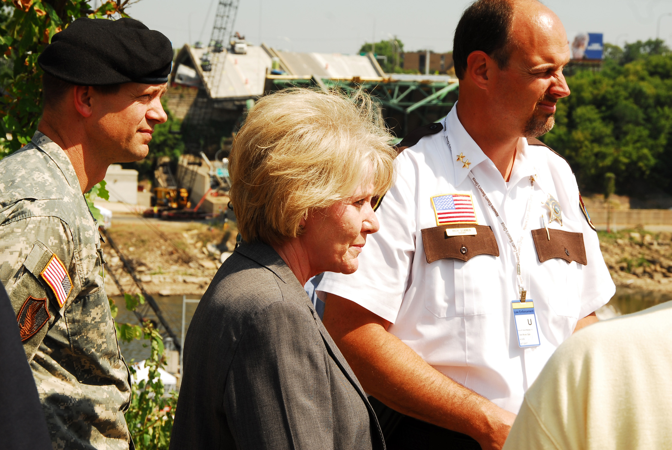 R. T. Rybak 미니애폴리스 시장과 팀 폴렌티 미네소타 주지사는 8월 2일 각각 시와 주에 비상사태를 선포했다.[65][66][224][225] 조지 W. 부시 당시 미국 대통령은 8월 4일 현장을 방문하여 연방 정부의 지원을 약속하고, 메리 피터스 미국 교통부 장관을 재건 노력 책임자로 임명했다.[65][69][228] 현지 당국은 연방 수사국(FBI) 증거팀과[70][229] 8월 5일부터 도착한 미국 해군 잠수부들의 지원을 받았다.[90][247]