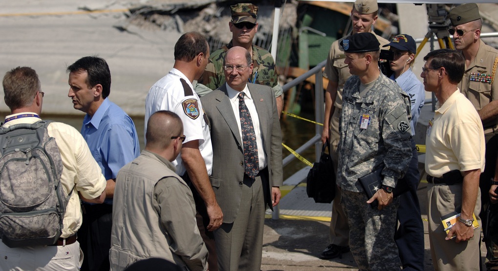 한편, 헤네핀 카운티 행정위원회는 8월 7일, 폴렌티 주지사에게 조지 W. 부시 당시 대통령에게 미니애폴리스 시와 헤네핀 카운티를 대규모 재해 지역으로 선포해 줄 것을 요청하도록 촉구했다.[316] 폴렌티 주지사는 8월 20일에 이 요청을 공식적으로 전달했다.[317] 그는 초기 대응 비용이 총 800만달러를 넘을 것으로 추산했으며(헤네핀 카운티 730만달러, 주 정부 기관 120만달러),[320] 다리 붕괴로 인한 주의 경제적 손실이 하루 40만달러에서 100만달러에 달할 것으로 추정했다.[321] 그러나 부시 행정부는 대규모 재해 선언 대신 긴급 사태 선언을 발령했다(8월 21일).[321][322] 이로 인해 미국 연방 재난 관리청(FEMA)의 지원은 8월 1일부터 15일까지 발생한 긴급 보호 조치 비용의 일부(75% 이상, 초기 500만달러 상한)에 국한되었으며, 잔해 제거, 다리 복구, 피해자 지원 등은 포함되지 않았다.[323][324]