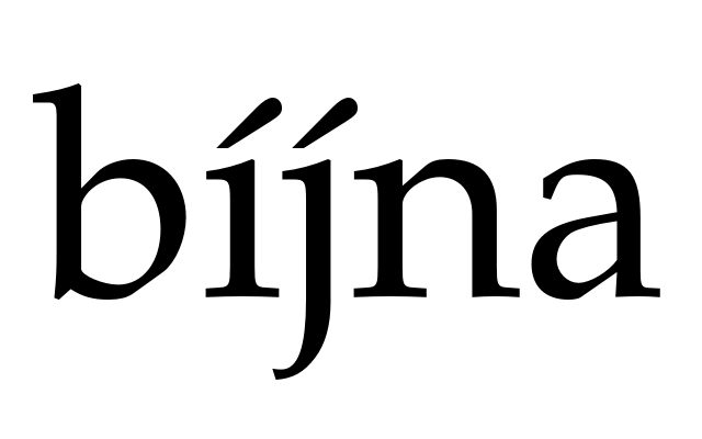 하지만 기술적인 제약 때문에 전자 문서에서는 ''j''의 악센트가 종종 생략되기도 한다: ''bíjna''.[12] 그럼에도 유니코드에서는 급성 악센트가 있는 ''j''를 결합 문자로 만드는 것이 가능하다(''bíj́na''). 하지만 이는 일부 글꼴이나 시스템에서 지원되지 않거나 제대로 표시되지 않을 수 있다. 이 ''j́''는 일반 ''j''(U+006A)와 결합 급성 악센트 ́(U+0301)의 조합이다.