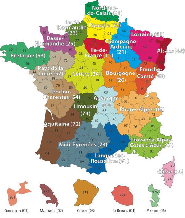 - 2글자 (데파르트망) + 3글자 (코뮌) - 프랑스 본토의 96개 데파르트망.
